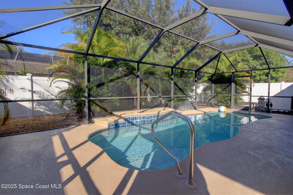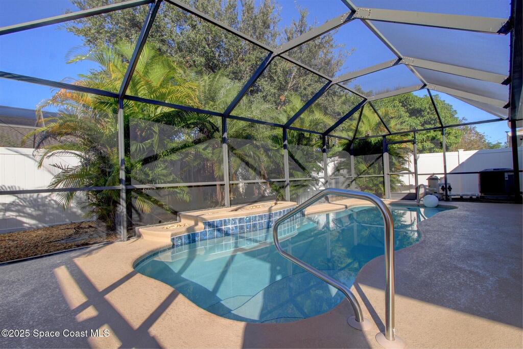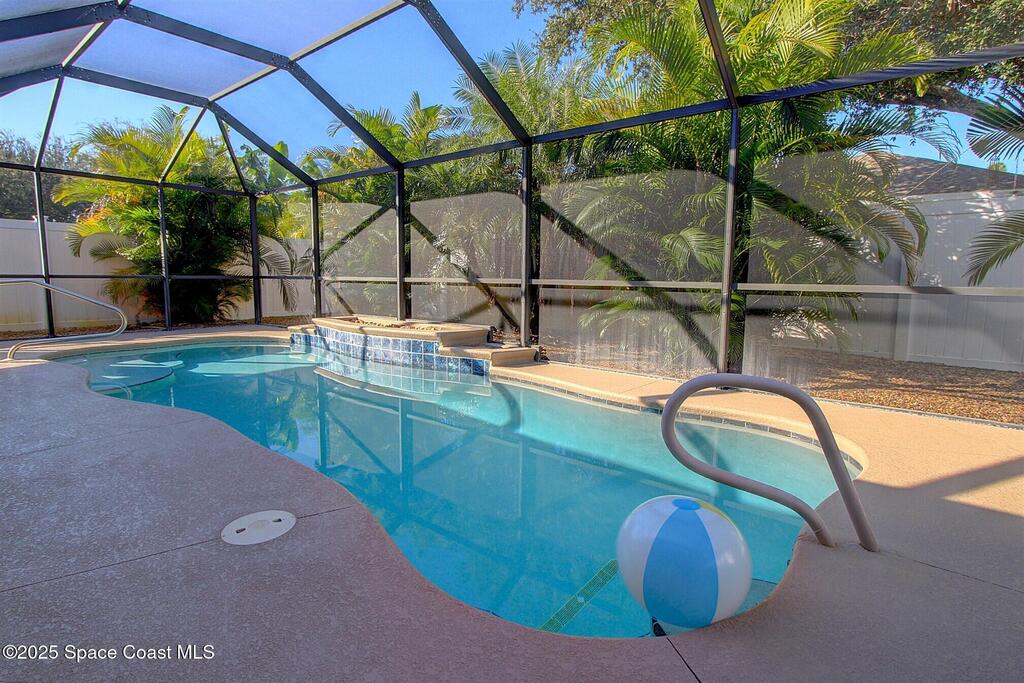 Desirable Gated West Melbourne Landings home. Very well-maintained. Freshly painted exterior and pool deck. Beautiful Salt Chlorinated Pool. Quaint screened in front porch. Kitchen has wood maple cabinetry and granite counters, open to family room. 3 Bedrooms with great closet space. Primary bedroom has its own ensuite. 2023 Roof and 2022 AC. Screened in front porch and pool lanai.