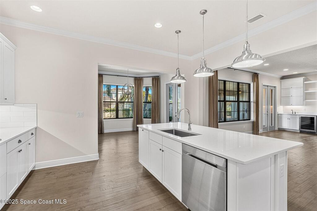 A standout in Viera's sought-after Reeling Park neighborhood, this spectacular 4/5 former model offers over $200K in contemporary upgrades and luxurious living spaces. As you enter through the foyer and pass the office, you're greeted by bright open spaces that draw in soft natural light through the glass front door and windows in the main living spaces. Family gatherings and quiet relaxation are a breeze in the main living space, featuring an electric fireplace and views to the courtyard. The modern kitchen features stainless steel appliances, gas cooktop, vented hood, white cabinetry, quartz counters, and a walk-in pantry. Step outside through the French doors to find a breezy, covered retreat equipped with paver flooring and a summer kitchen, perfect for summertime entertaining. The first-floor primary suite includes an incredible walk-in closet and a spa-like ensuite bathroom with glass and tile shower and soaking tub. . Upstairs, enjoy function and flexibility SEE ''MORE''