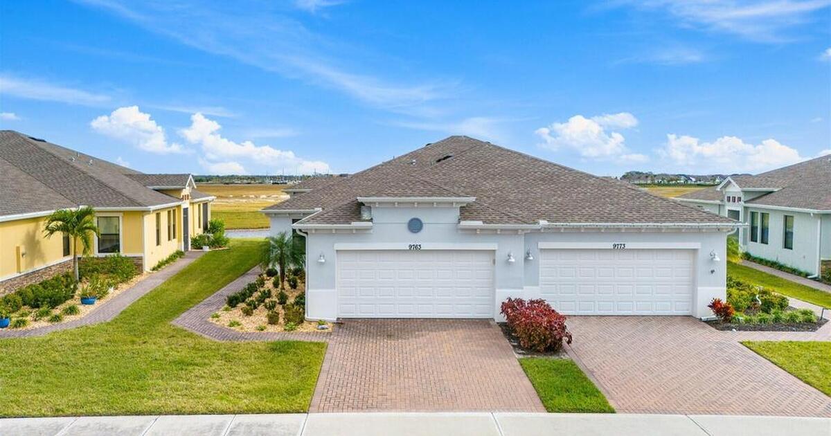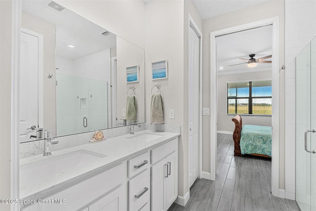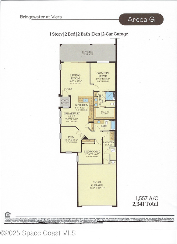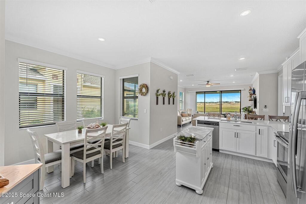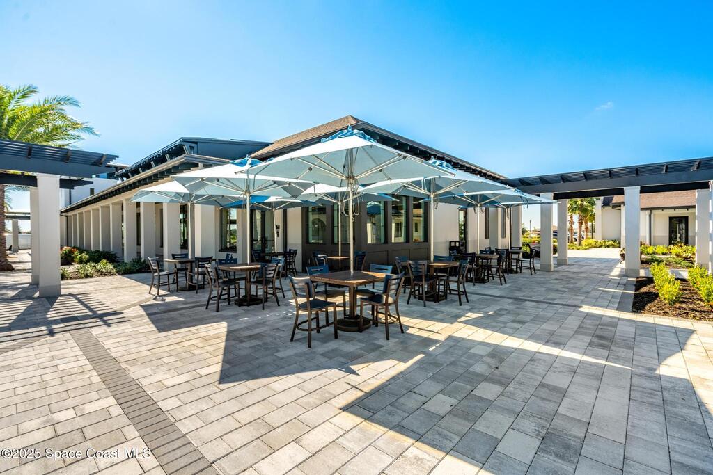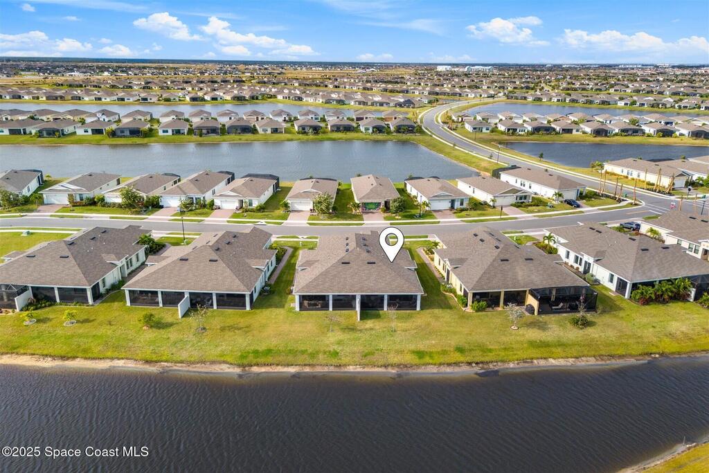 Must See 1565 Sq. ft. waterfront home in in Bridgewater, Viera's sought after 55+ resort style gated community! This 2 bedroom plus study, 2 bath, 2 car oversized garage (20X21) home checks off all the boxes: plank tile floors and crown molding throughout, 8' doors, deluxe light package with LED lights in Great Room and Primary Bedroom, and 5 ceiling fans. Designer kitchen with staggered white cabinets, marble look quartz counters, decorator backsplash, and portable island with extra drawers and cabinets! Luxury primary bath with large shower w/ bench, quartz counters and upgraded faucets! Study with double doors includes a murphy bed for those out-of-town guests! Laundry Rm has extra closet! Private screened-in entry and 270 sq. ft. back porch. Unwind at the private clubhouse, featuring a heated pool w/ waterfall & spa, fitness room, billiard room, coffee lounge, lit tennis & pickle ball courts, and a movie theater! The HOA covers lawn care! Short car ride to Atlantic beaches!