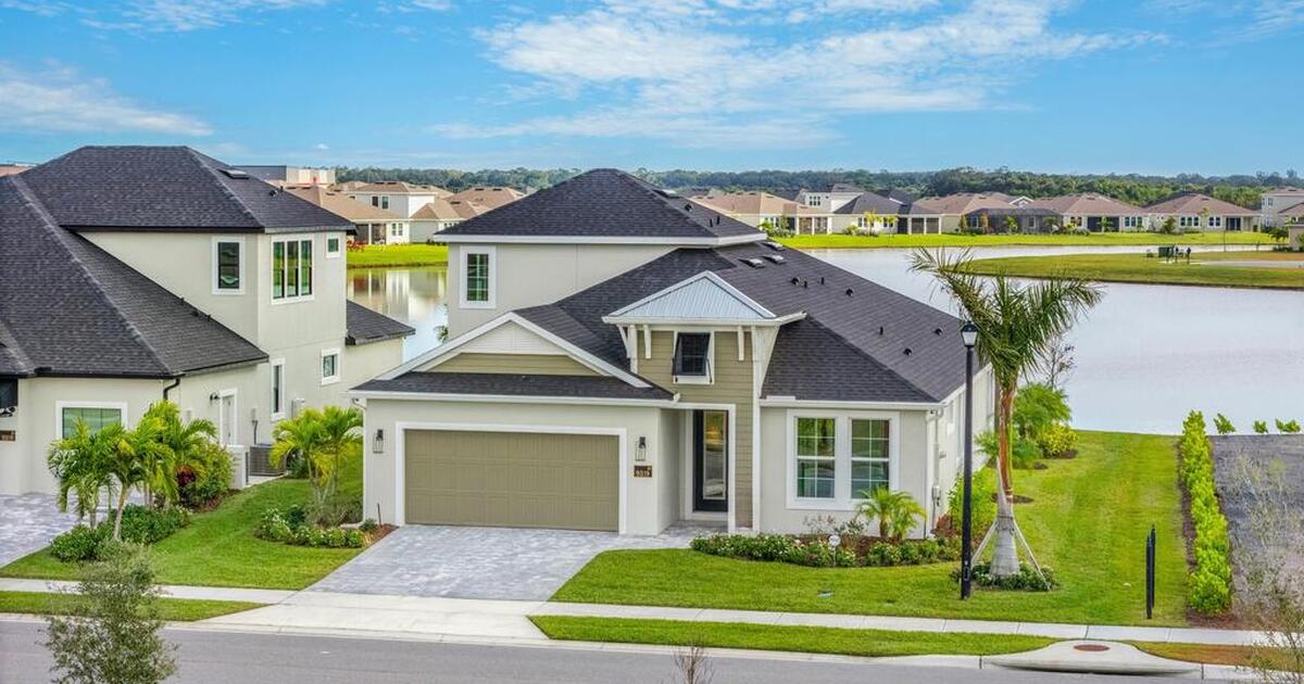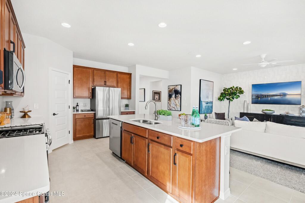 Lakefront Former Model Home in Viera where modern elegance meets an active, amenity-rich lifestyle. Built in 2023 and sited for long water views, this home welcomes you with brand new luxury vinyl plank flooring through the main living areas and an open floorplan with high ceilings that frame the lake from an oversized screened porch an ideal spot for morning coffee, sunset gatherings, or relaxed entertaining. The gourmet island kitchen features quartz countertops, stainless steel appliances, a pantry, and a large dining area overlooking the water, while a dedicated office with French doors provides a quiet workspace. The downstairs primary suite offers an expansive walk-in closet and a spa-like bath with double sinks, and two additional bedrooms plus two full baths on the main level ensure comfortable space for family and guests. Upstairs a spacious loft serves as a flexible family or recreation room accompanied by an additional bedroom and full bath. Located in Viera's award
