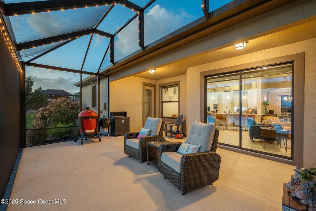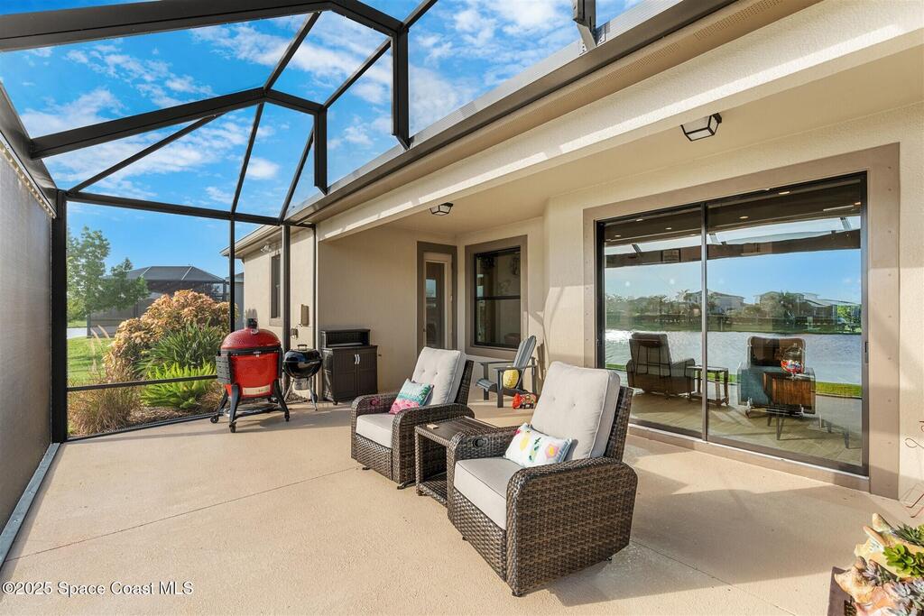Enjoy gorgeous lakefront views in this meticulously maintained contemporary CBS home in the sought-after gated community of Stonecrest at Viera. Located on one of the larger lots in the neighborhood, this house boasts double water views. Decorating for the seasons is as easy as pushing a button with the exterior custom lighting system. A glass-door entryway welcomes you into the open floorplan, with a formal dining room and flex/bonus room to either side of the foyer. Natural light from large double pane windows guide you through to the kitchen, great room, and breakfast nook. At the heart of the home, the light and bright kitchen offers stainless steel appliances, a vented hood, gas range, convention oven, a breakfast bar and pantry. Move through the 8 ft. sliders to the extended screened patio and take in the sparkling lake views while cooking on the grill. The expansive primary bedroom with its own sitting area includes a spacious ensuite SEE ''MORE