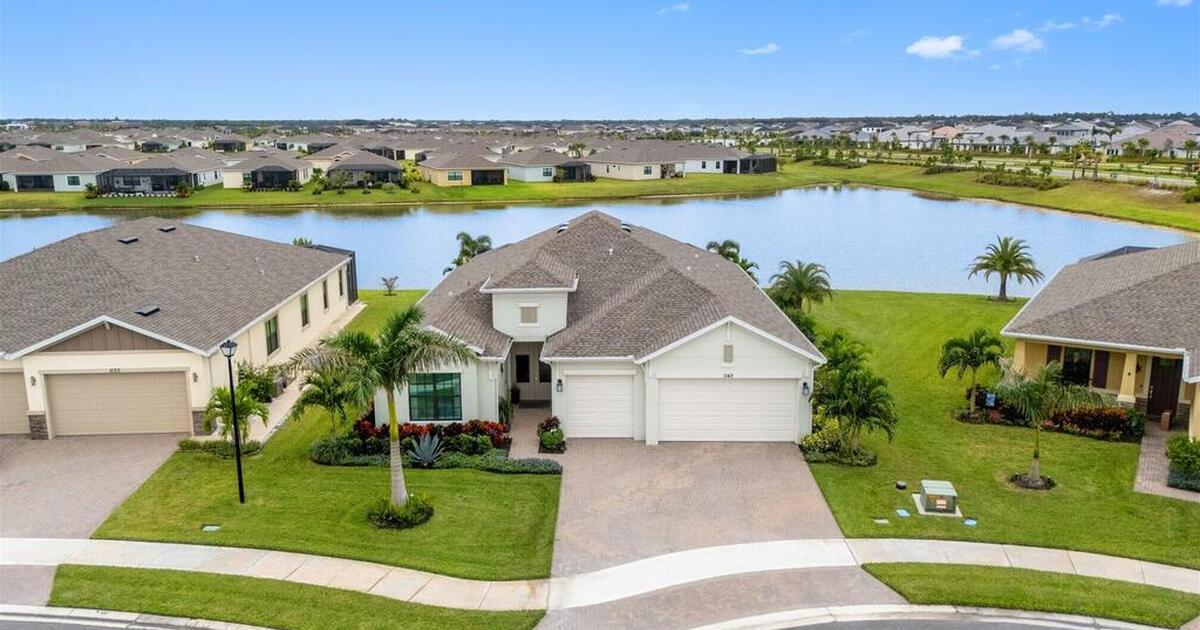 Waterfront luxury in Bridgewater, Viera's 55+ resort style gated community! This striking 3-bedroom + den, 3-bath, 3-car garage home was inspired by the builder's decorated model and features elegant upgrades such as custom shiplap accent walls and designer trim plus great room built-ins! Additional ''must-have'' features include IMPACT WINDOWS & SLIDERS, tile and crown molding throughout, a gourmet kitchen w/ wall ovens, cooktop and an oversized island. The primary suite boasts a sumptuous bath w/ walk-in shower, soaking tub, and dual walk-in custom closets. Perfect for entertaining, the great room's expansive sliders lead to a stunning 50'x15' screened lanai overlooking the water. And overnight guests enjoy their own en-suite retreat for comfort and privacy. Even the garage impresses with epoxy floors, overhead storage, and 240V outlet for an electric car. Bridgewater's private clubhouse offers a heated pool, spa, fitness center, tennis & pickleball courts, and even a movie theater