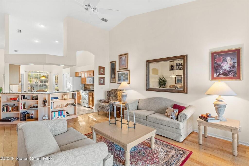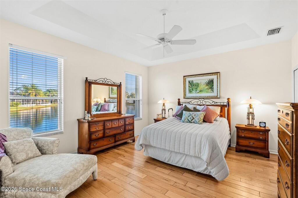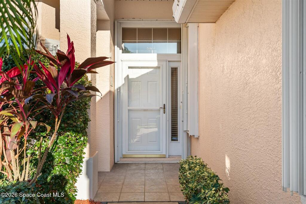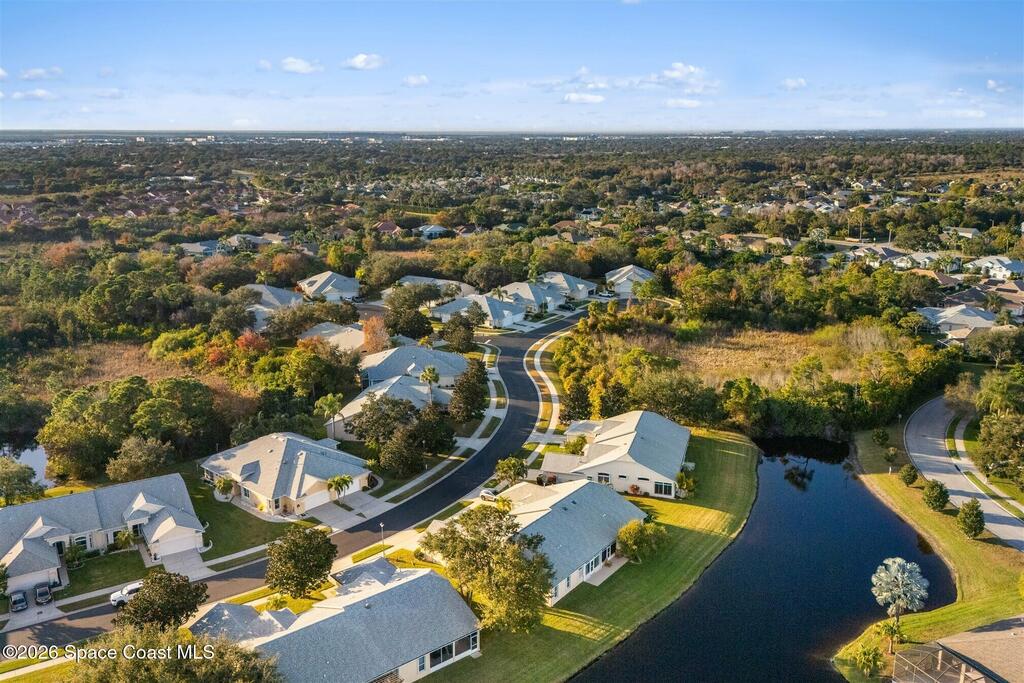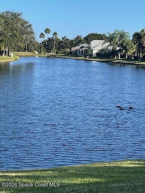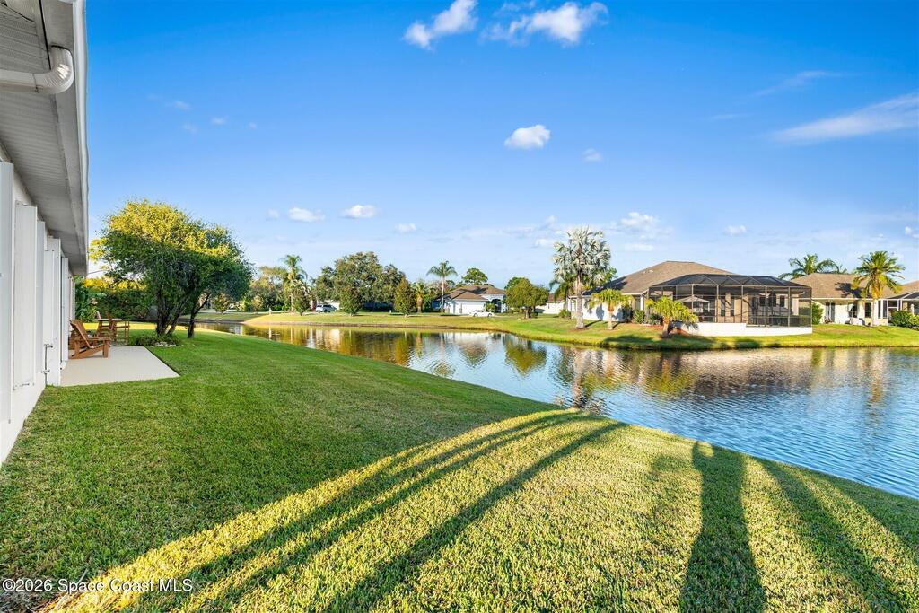 Enter through the community gate of Magnolia Pointe in Suntree and follow around to this 3-bedroom, 2-bath, 2-car garage home with water views! This popular one level floor plan has upgrades that include: granite countertops, new shower in hall bathroom, 140 sq. ft. porch with air (total sq. footage= 1,921), engineered wood flooring by Classic Wood Floors in the main living areas and all bedrooms (no carpet). Enjoy the east facing views and watch the ducks and wildlife on the waterway from the patio, porch, great room or primary bedroom.This half-duplex offers a low-maintenance lifestyle which includes lawn and sprinkler care, roof replacement, exterior painting, exterior insurance and more. A community pool and cabana complete the picture for a great lifestyle in a quiet community near shopping and restaurants.Original owners leaving their much-loved home and community to be closer to children. Roof (2016 by HOA), Water Heater (2014, HVAC (2016)