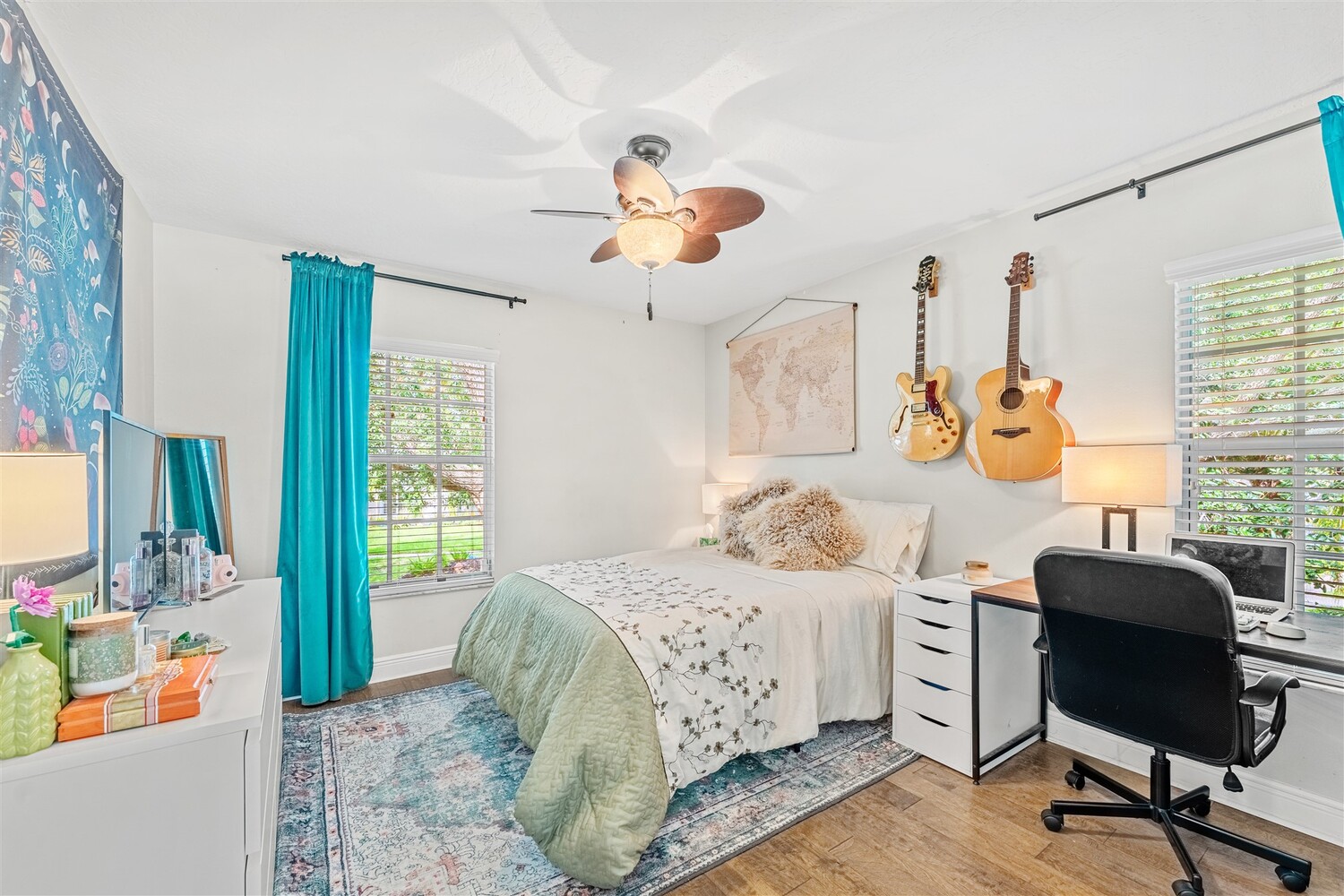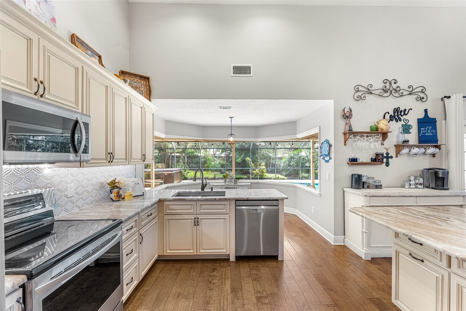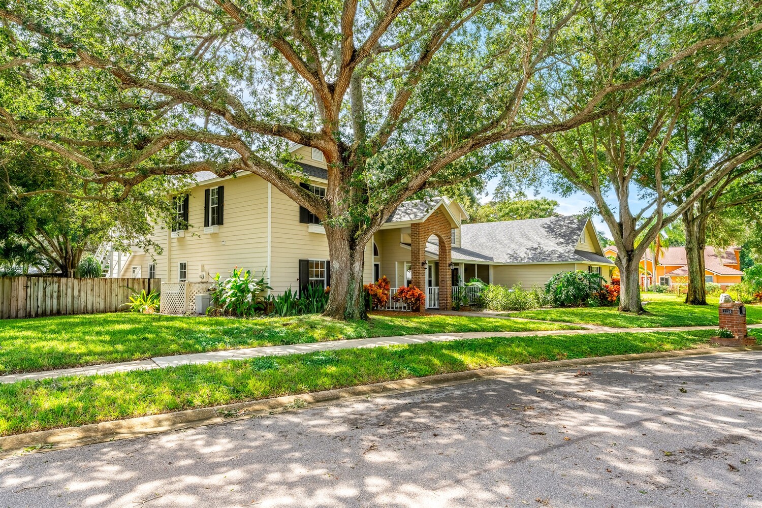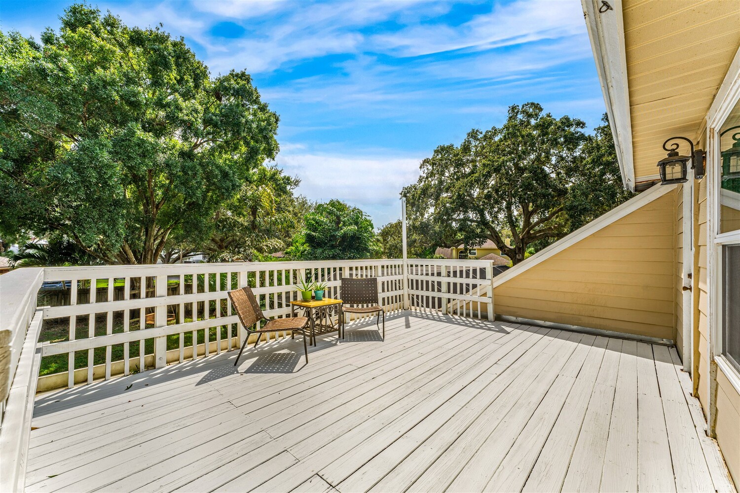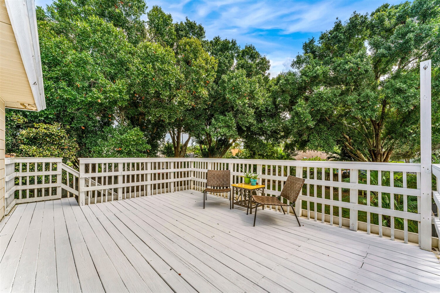 Welcome to your dream home in the highly coveted Georgiana Settlement of Merritt Island! Located on a private corner lot in a picturesque tree-lined subdivision, this 2,915 sq. ft. home sits on nearly half an acre, surrounded by the shade of stately grandfather oaks. Inside, you'll find vaulted ceilings and a beautifully updated open-concept living area, with remodeled kitchen and bathrooms that blend modern design with functional elegance. This 4-bedroom, 3-bathroom residence is designed for both entertaining and comfortable living. Relax by the wood-burning fireplace or step outside to your private, fenced backyard oasis. Here, you'll enjoy a sparkling pool, an expansive upper-level sundeck, and ample space for outdoor gatherings. The large yard benefits from a full lawn irrigation system, and a newer roof adds lasting value. The primary suite is a true retreat, featuring an updated en-suite bathroom, three closets with built-in shelving, and a home office/additional room that opens through French doors to the pool deck. Downstairs, an additional bedroom with French doors to a screened porch area can serve as a home office, art studio, or guest room. Upstairs, two additional bedrooms share a Jack-and-Jill bathroom and offer access to a large upper-level sundeck. For those who love the water, the community dock on the Banana River is just a short walk away, perfect for kayaking, fishing, or taking in serene waterfront views. The community also has a picturesque gazebo on a pond. Quiet, convenient location in between the Pineda Causeway and 520. Don't miss the opportunity to own this exceptional home, where luxury and Southern old Florida charm meet in one of Merritt Island's most desirable neighborhoods.
