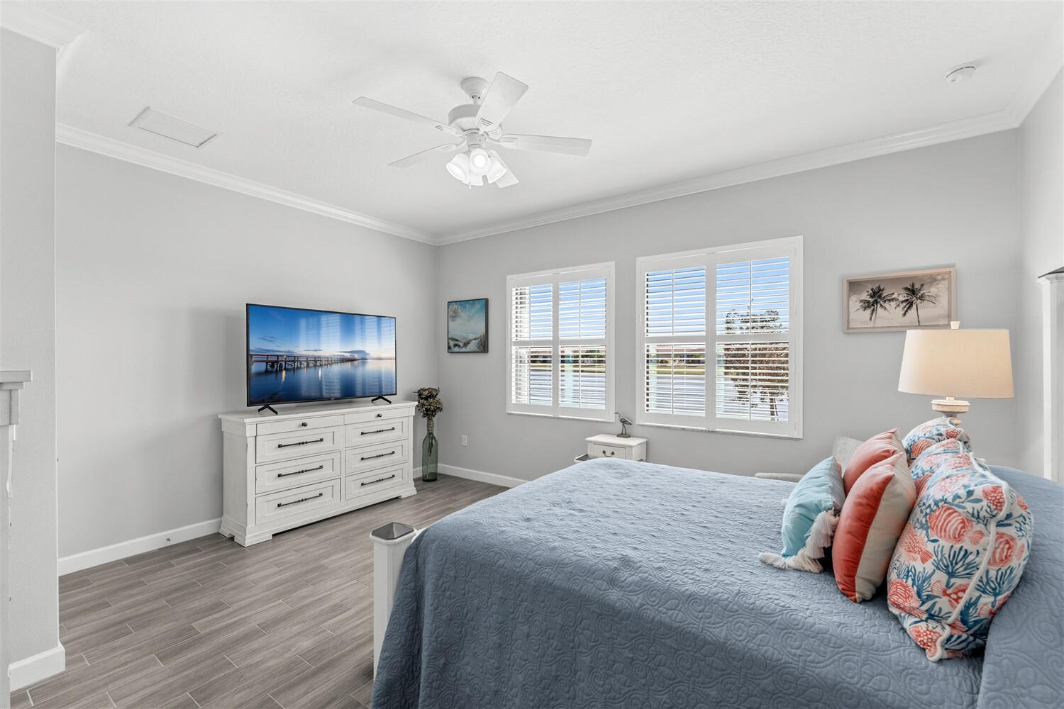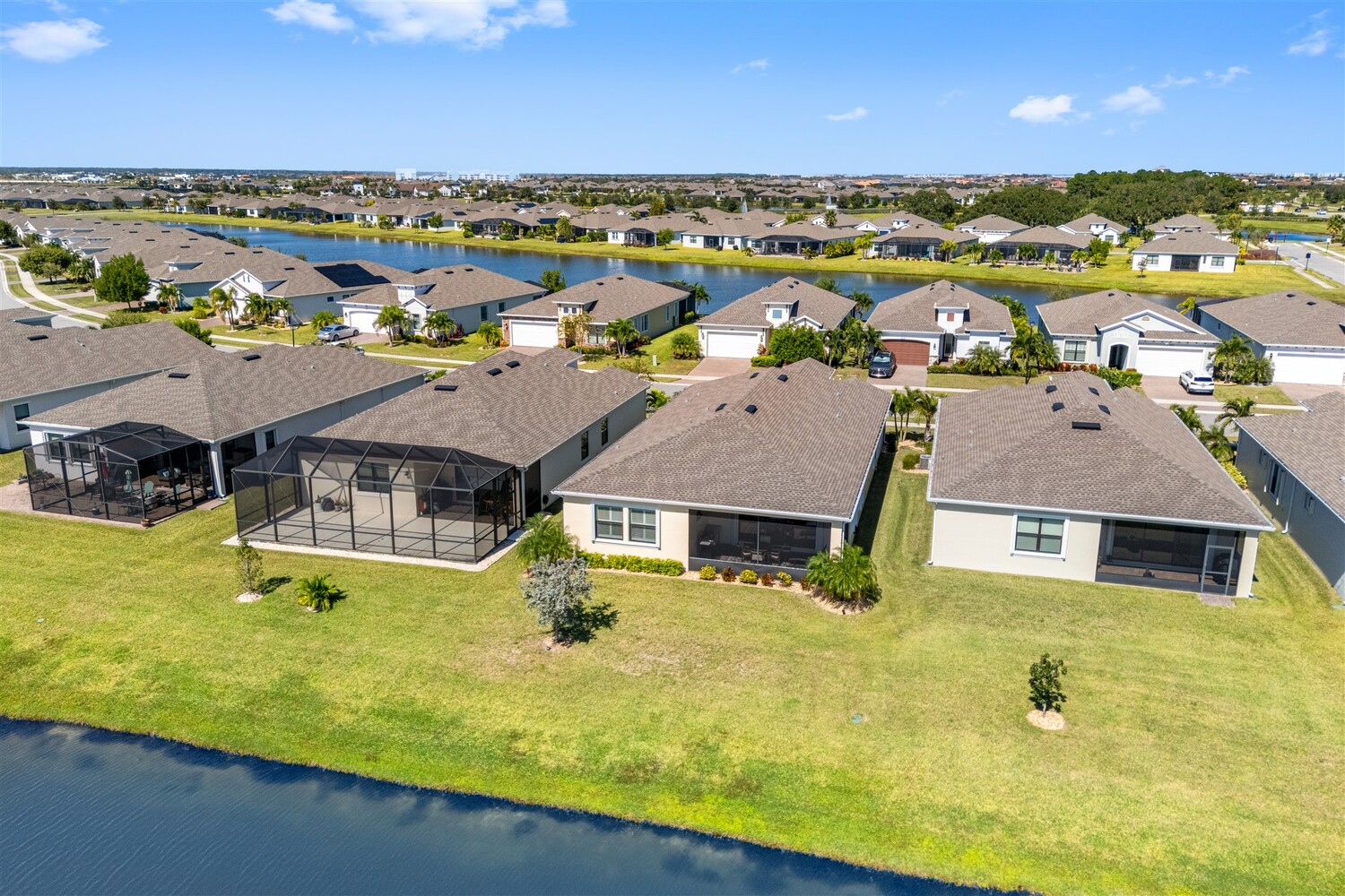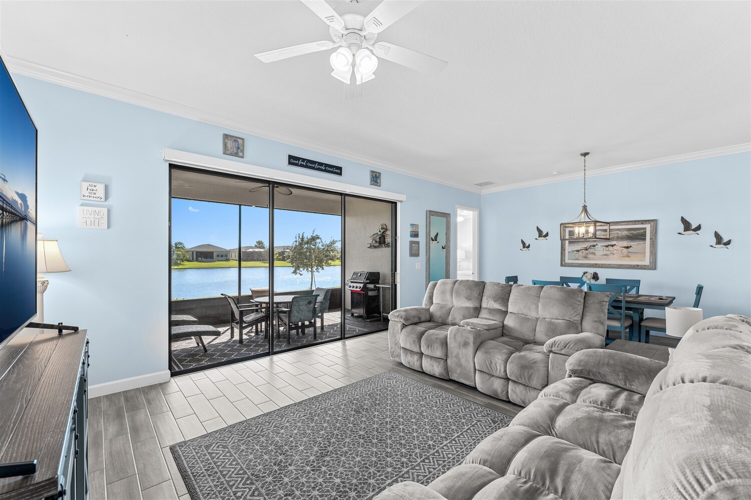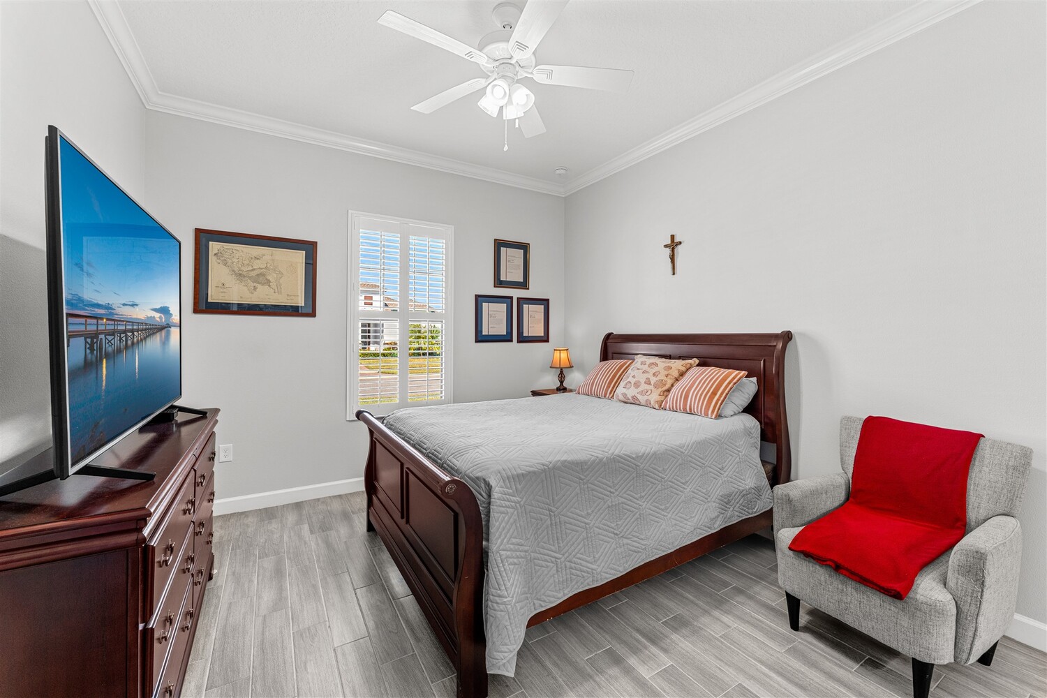Pristine 3 bedroom plus study, 3 ½ bath home in Bridgewater, Viera's popular 55+ resort style community! Move in ready with every upgrade: new porcelain tile plank floors throughout, crown molding, plantation shutters, screened in lanai, 8' doors, epoxy garage floors and more! Perfect for guests, every bedroom is an ensuite with its own bath! Large three panel sliders in great room bring the beautiful lake views into your home and set it apart from similar key largo style homes! The outside is as meticulous as the interior with stone trim enhancing the freshly painted exterior. As you approach the home, you will notice the stone landscape beds and impact glass etched front door. Accordion shutters are on all windows and sliders and a transformer switch for a future generator add to your peace of mind. The private clubhouse offers a large heated pool and spa, fitness center, tennis & pickleball courts and a movie theater! Short drive to ocean beaches, cruise ships, shopping, dining!