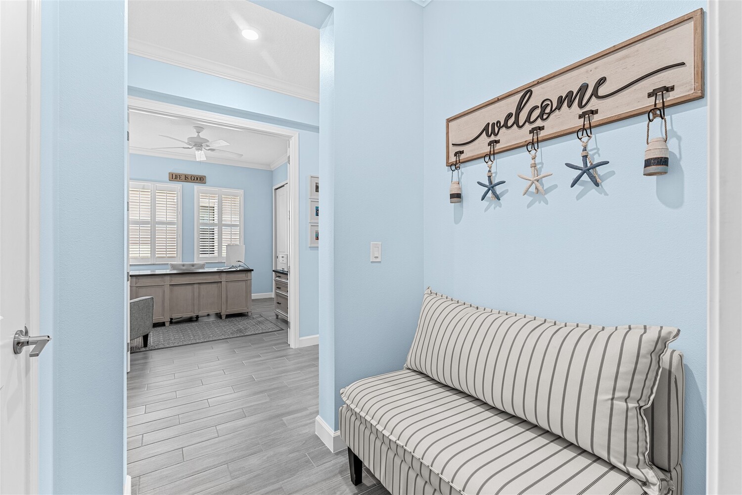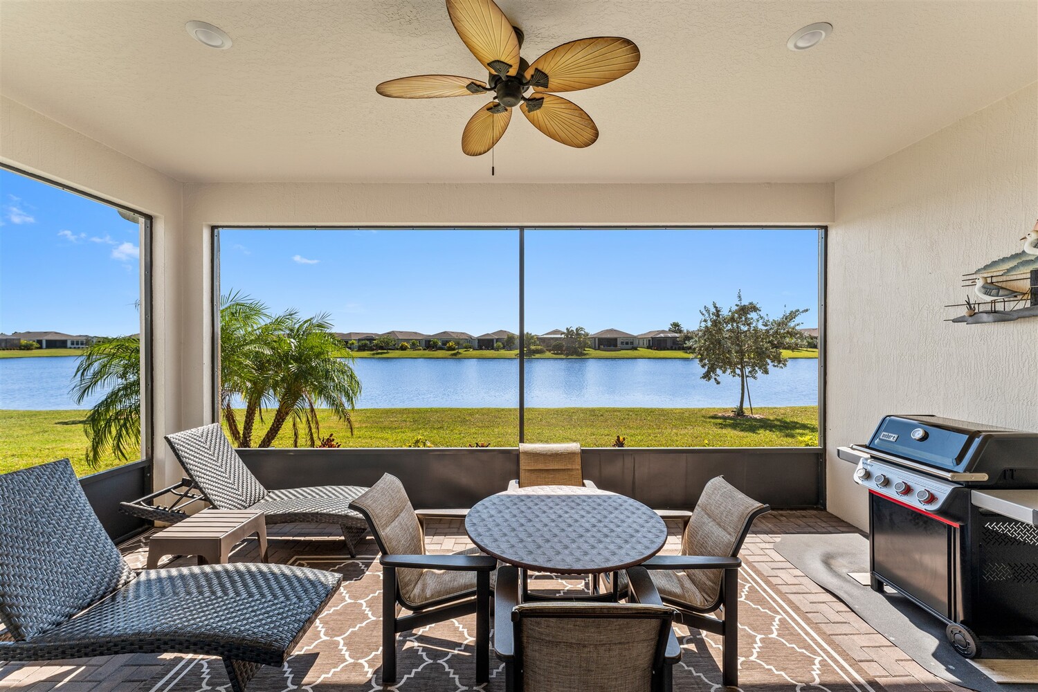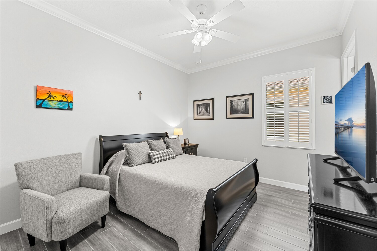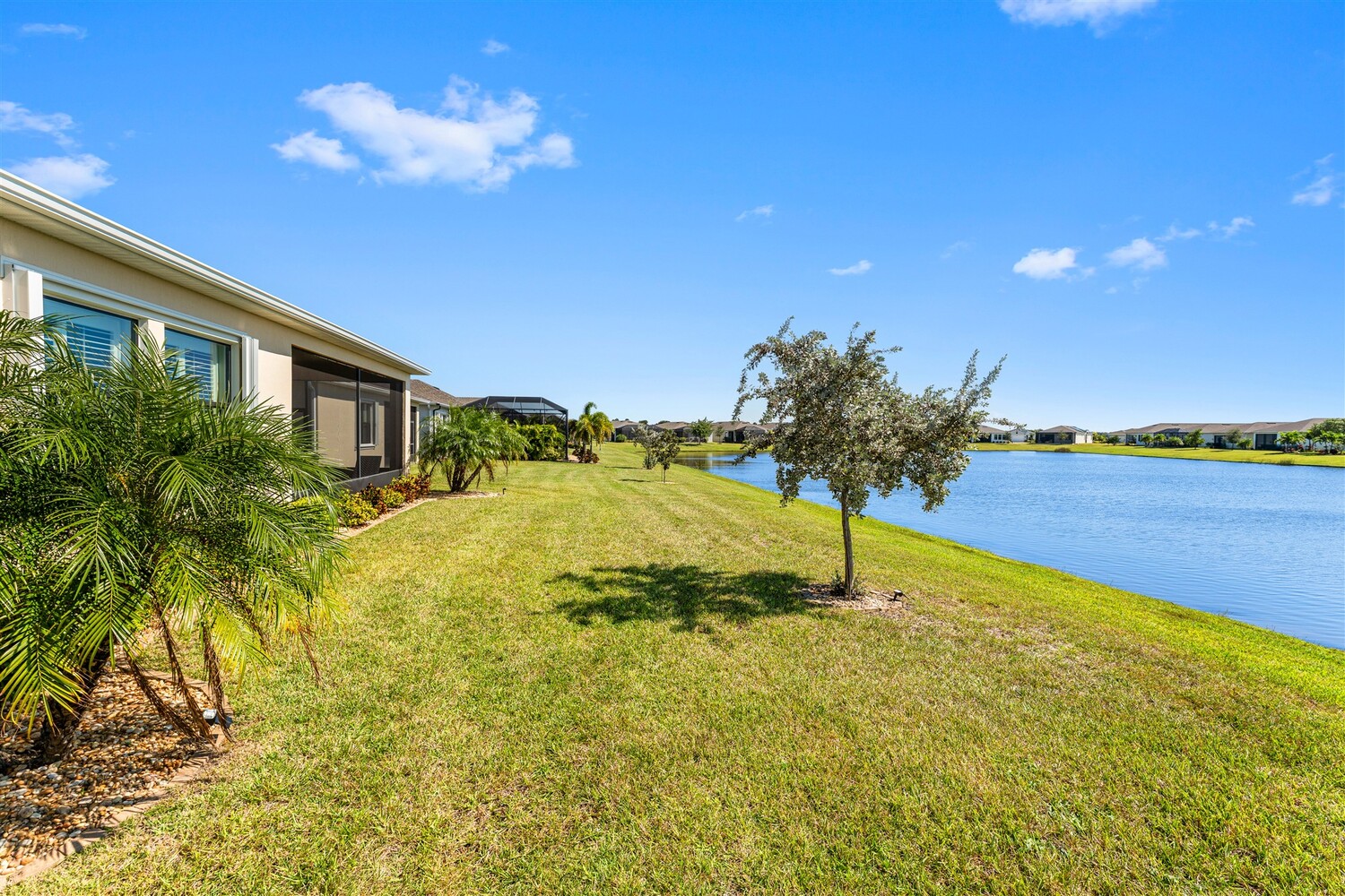 Pristine 3 bedroom plus study, 3 ½ bath home in Bridgewater, Viera's popular 55+ resort style community! Move in ready with every upgrade: new porcelain tile plank floors throughout, crown molding, plantation shutters, screened in lanai, 8' doors, epoxy garage floors and more! Perfect for guests, every bedroom is an ensuite with its own bath! Large three panel sliders in great room bring the beautiful lake views into your home and set it apart from similar key largo style homes! The outside is as meticulous as the interior with stone trim enhancing the freshly painted exterior. As you approach the home, you will notice the stone landscape beds and impact glass etched front door. Accordion shutters are on all windows and sliders and a transformer switch for a future generator add to your peace of mind. The private clubhouse offers a large heated pool and spa, fitness center, tennis & pickleball courts and a movie theater! Short drive to ocean beaches, cruise ships, shopping, dining!