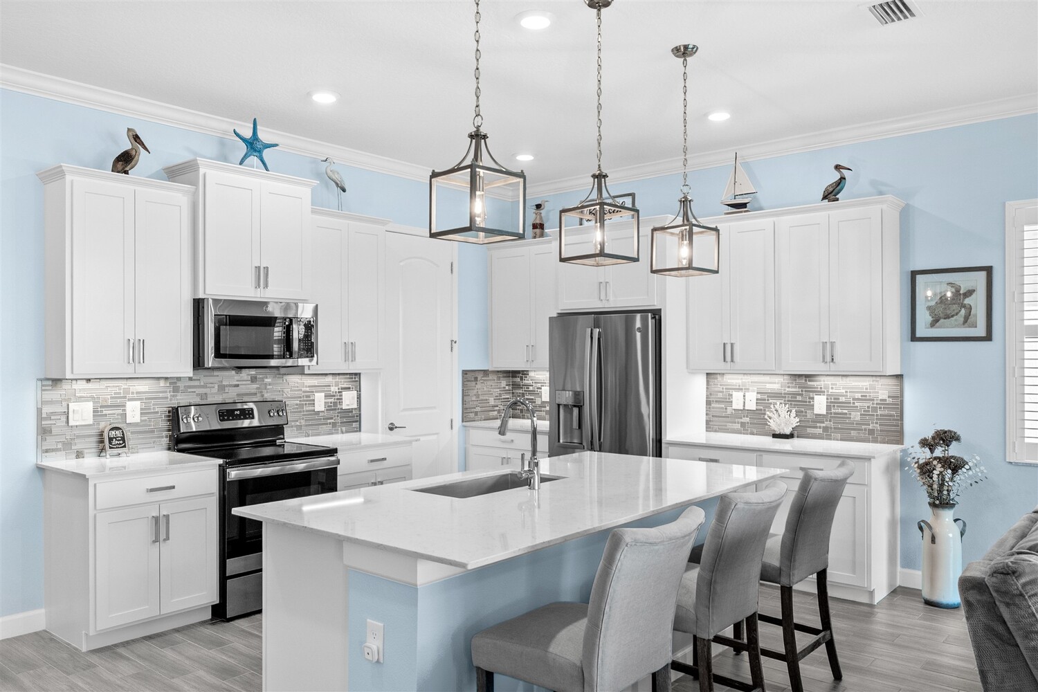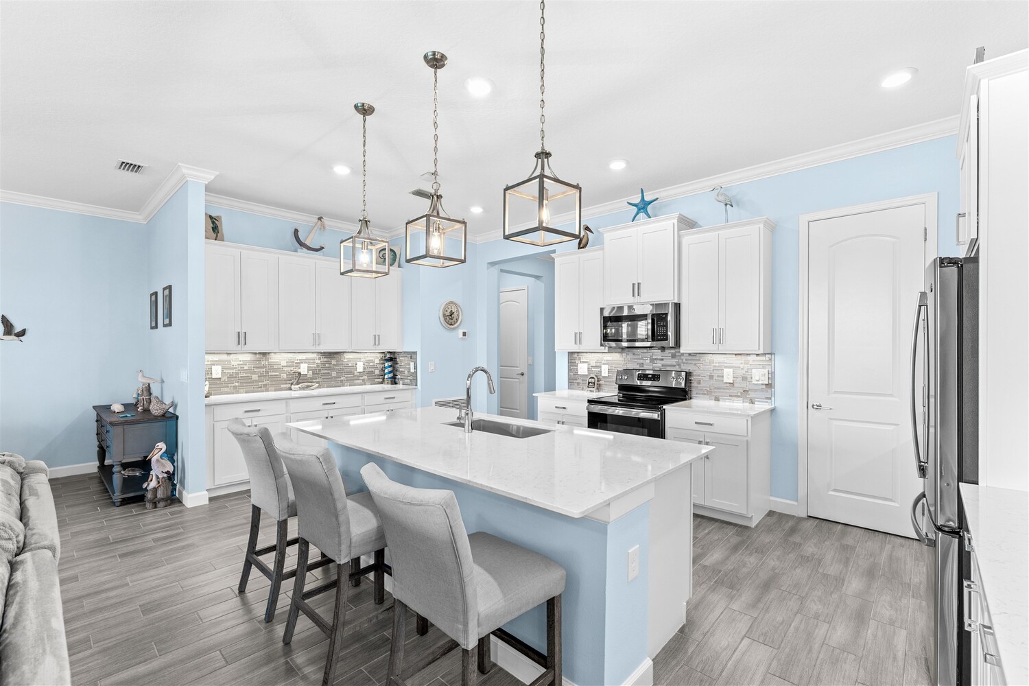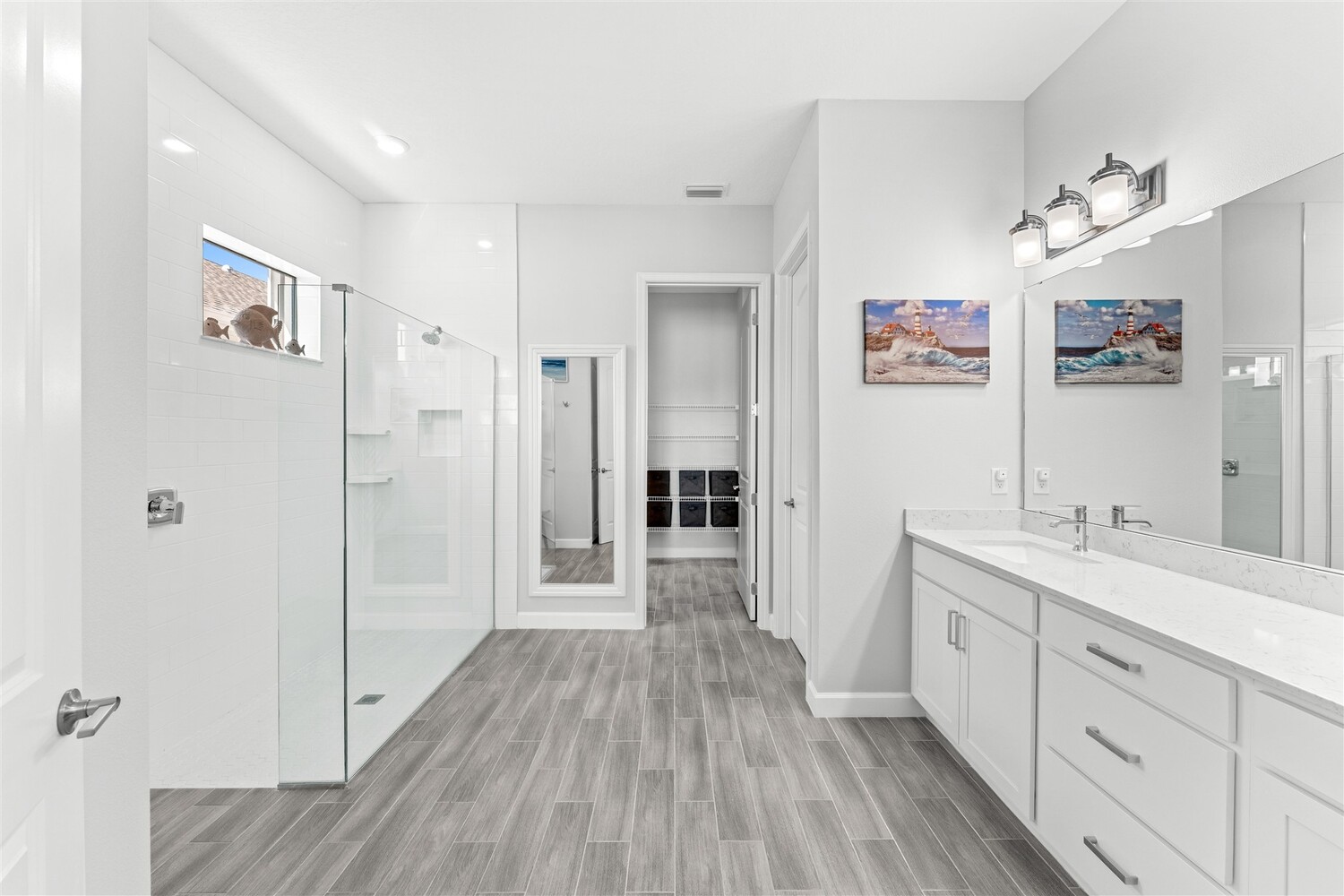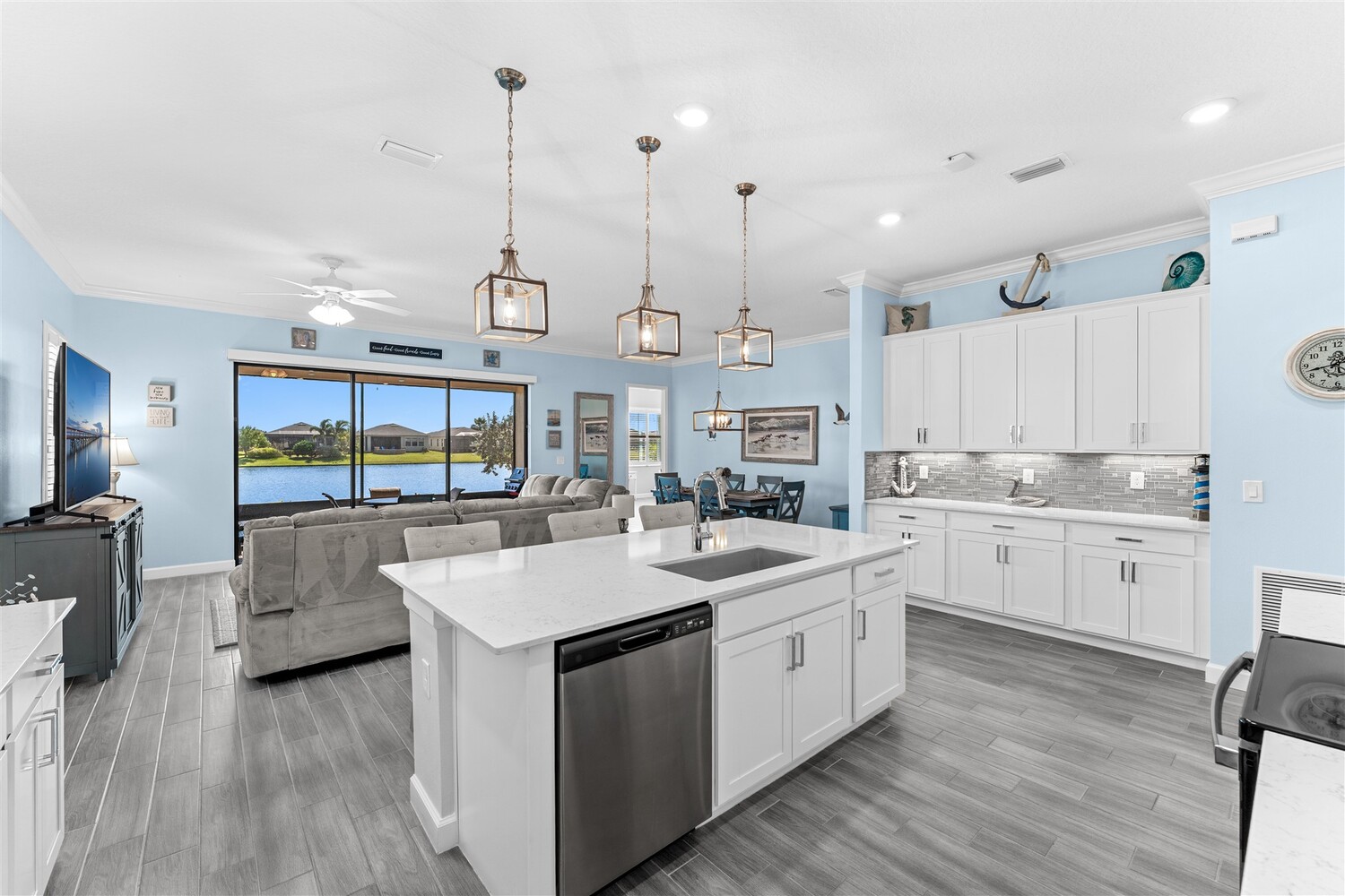 Pristine 3 bedroom plus study, 3 ½ bath home in Bridgewater, Viera's popular 55+ resort style community! Move in ready with every upgrade: new porcelain tile plank floors throughout, crown molding, plantation shutters, screened in lanai, 8' doors, epoxy garage floors and more! Perfect for guests, every bedroom is an ensuite with its own bath! Large three panel sliders in great room bring the beautiful lake views into your home and set it apart from similar key largo style homes! The outside is as meticulous as the interior with stone trim enhancing the freshly painted exterior. As you approach the home, you will notice the stone landscape beds and impact glass etched front door. Accordion shutters are on all windows and sliders and a transformer switch for a future generator add to your peace of mind. The private clubhouse offers a large heated pool and spa, fitness center, tennis & pickleball courts and a movie theater! Short drive to ocean beaches, cruise ships, shopping, dining!