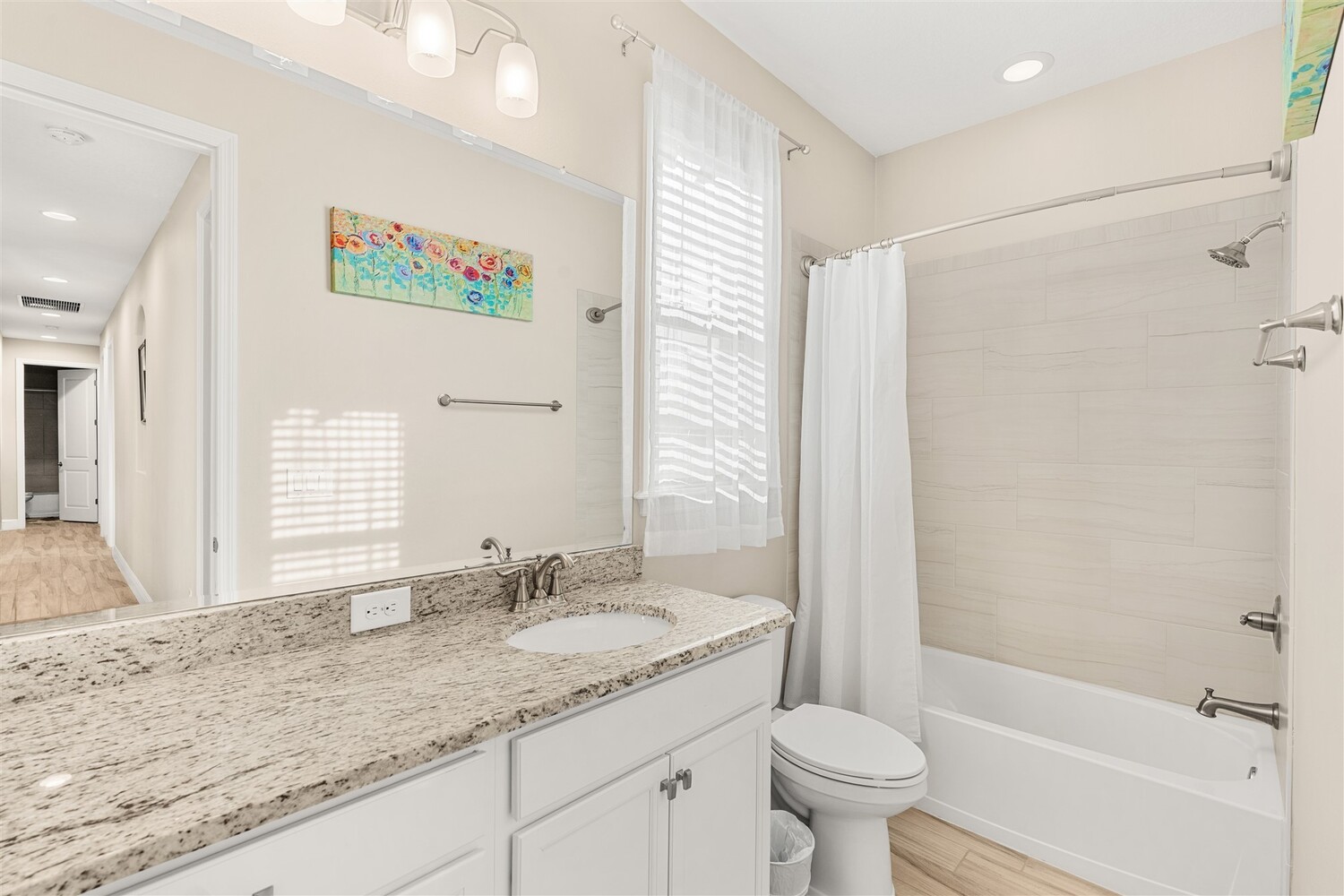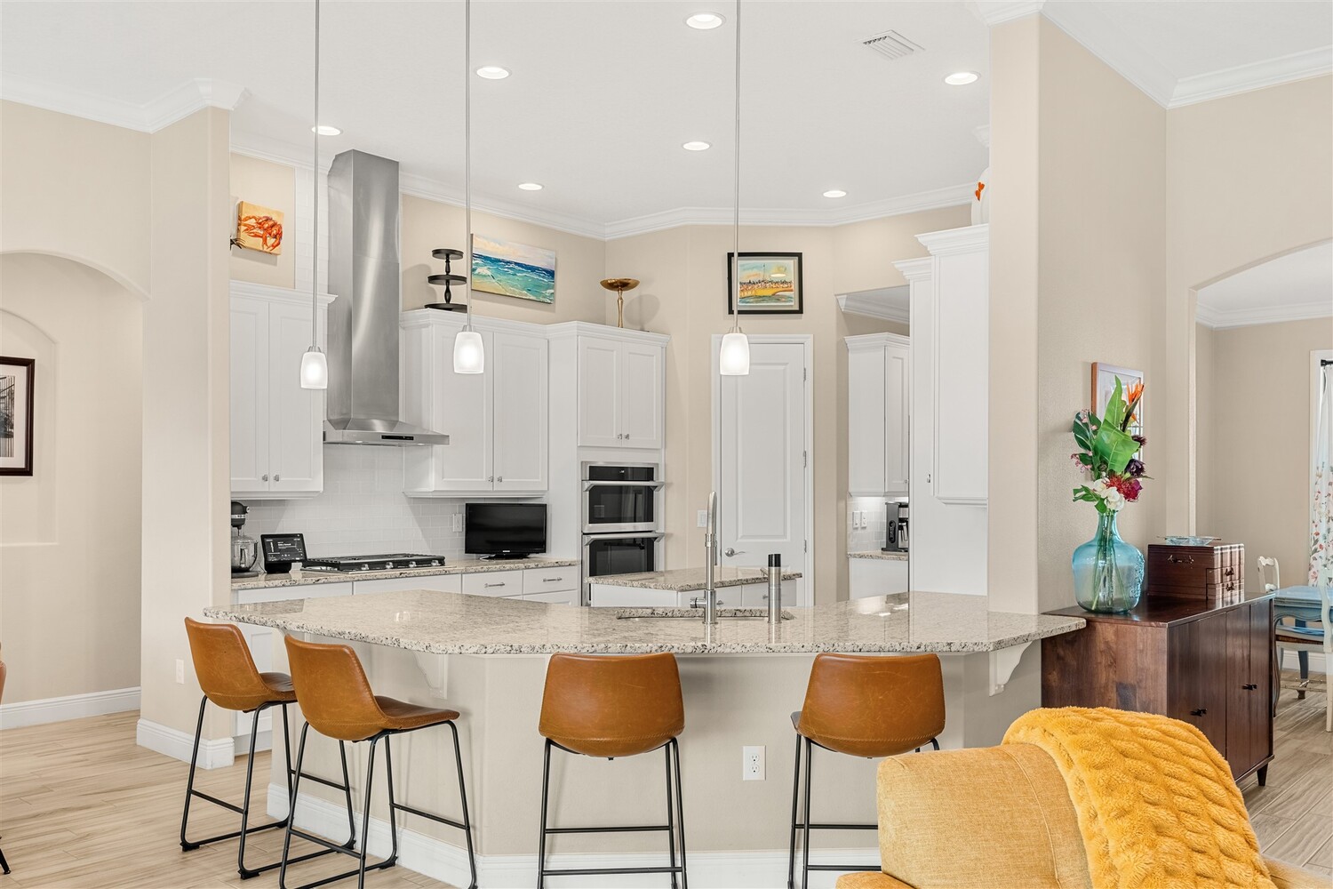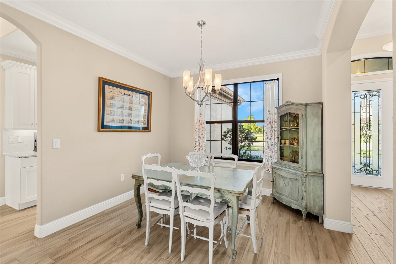 Enjoy gorgeous lakefront views in this meticulously maintained contemporary CBS home in the sought-after gated community of Stonecrest at Viera. Located on one of the larger lots in the neighborhood, this house boasts 117 ft of waterfront. Decorating for the seasons is as easy as pushing a button with the exterior custom lighting system. A glass-door entryway welcomes you into the open floorplan, with a formal dining room and flex/bonus room to either side of the foyer. Natural light from large double pane windows guide you through to the kitchen, great room, and breakfast nook. At the heart of the home, the light and bright kitchen offers stainless steel appliances, a vented hood, gas range, convention oven, a breakfast bar and pantry. Move through the 8 ft. sliders to the extended screened patio and take in the sparkling lake views while cooking on the grill. The expansive primary bedroom with its own sitting area includes a spacious ensuite with dual vanities, a soaking tub and a glass and tile shower. Three additional bedrooms offer space and functionality for a growing family, visitors, or even a studio workspace. Garage is oversized and can accommodate a golf cart plus 2 vehicles. The exclusive gated community of Stonecrest offers walking trails, sports courts, and access to Addison Village Club, and keeps you close to the very best restaurants, shopping, and entertainment that Brevard has to offer.