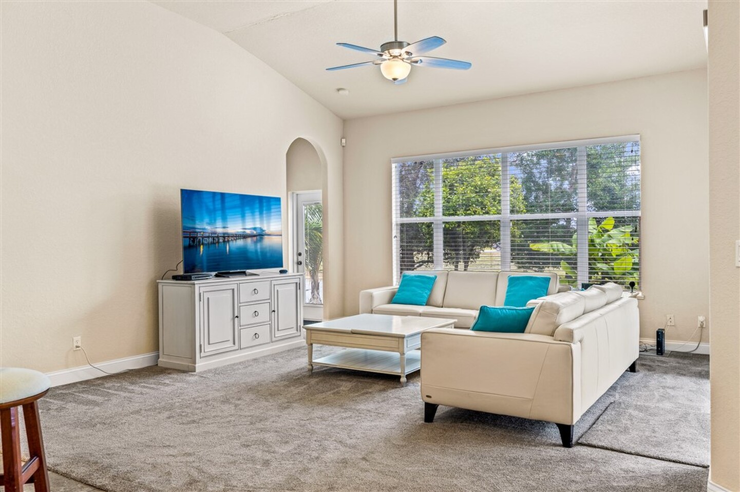 This METICULOUSLY MAINTAINED 4 bedroom, 3 bath, waterfront home looks as good as it did the day it was completed! Gorgeous glass double entry front doors leading into a grand formal living and dining room with 8 ft sliders over looking the pool. Custom wood kitchen cabinets with Corian countertops, and stainless steel appliances, including new fridge. Brand new A/C unit installed 11/21, and new roof installed in 2020. Spacious master suite with large walk in closet, additional closet, jetted bath tub, dual sinks, and large walk in shower. Private 4th bedroom and bath located to the rear of the house, and 2nd and 3rd bedrooms share a Jack and Jill bath. Golf cart friendly gated community with easy access to schools, shopping, and dining. Great community park, pool, and sports amenities!