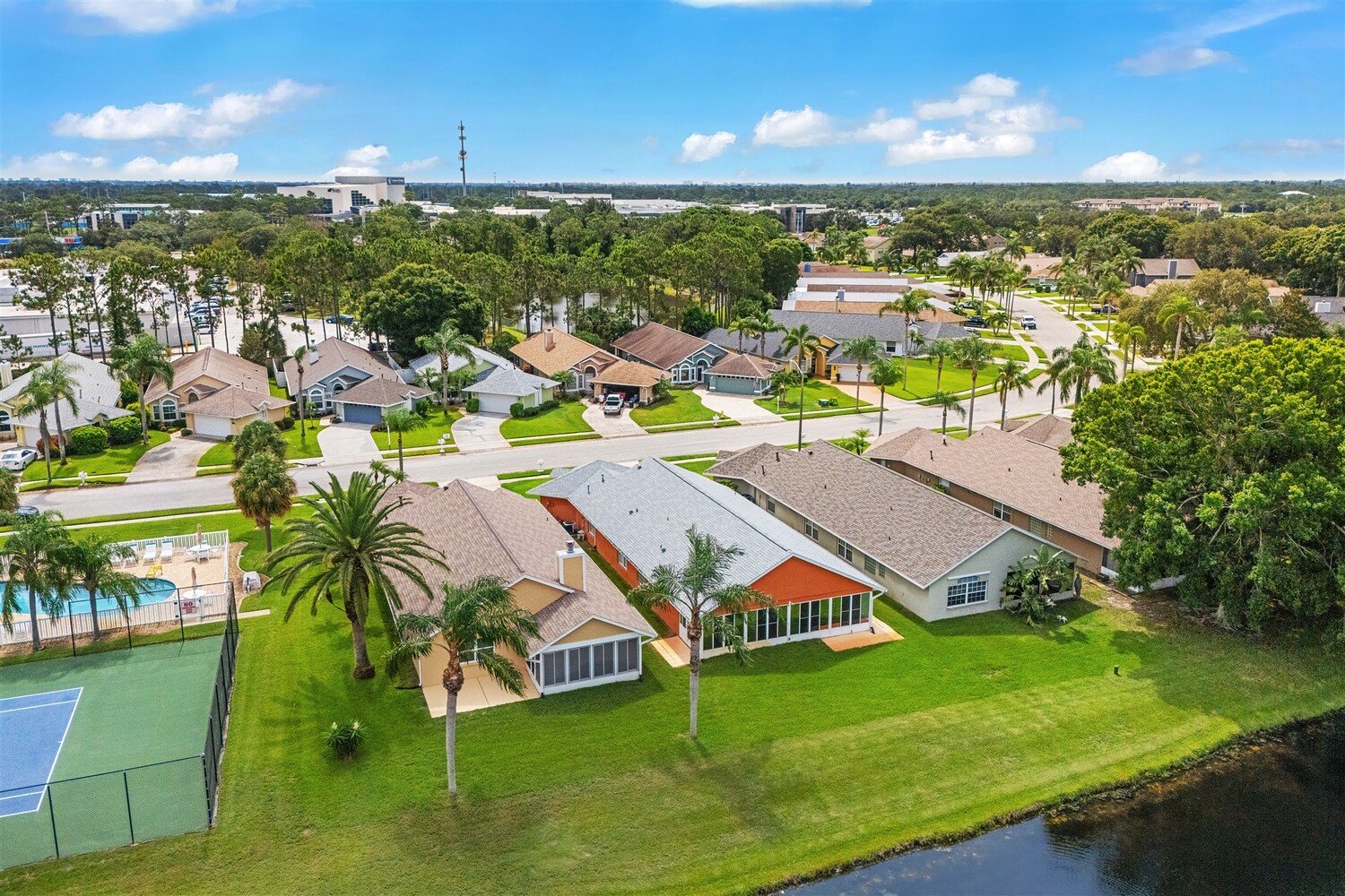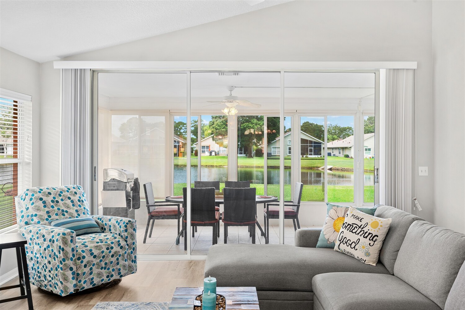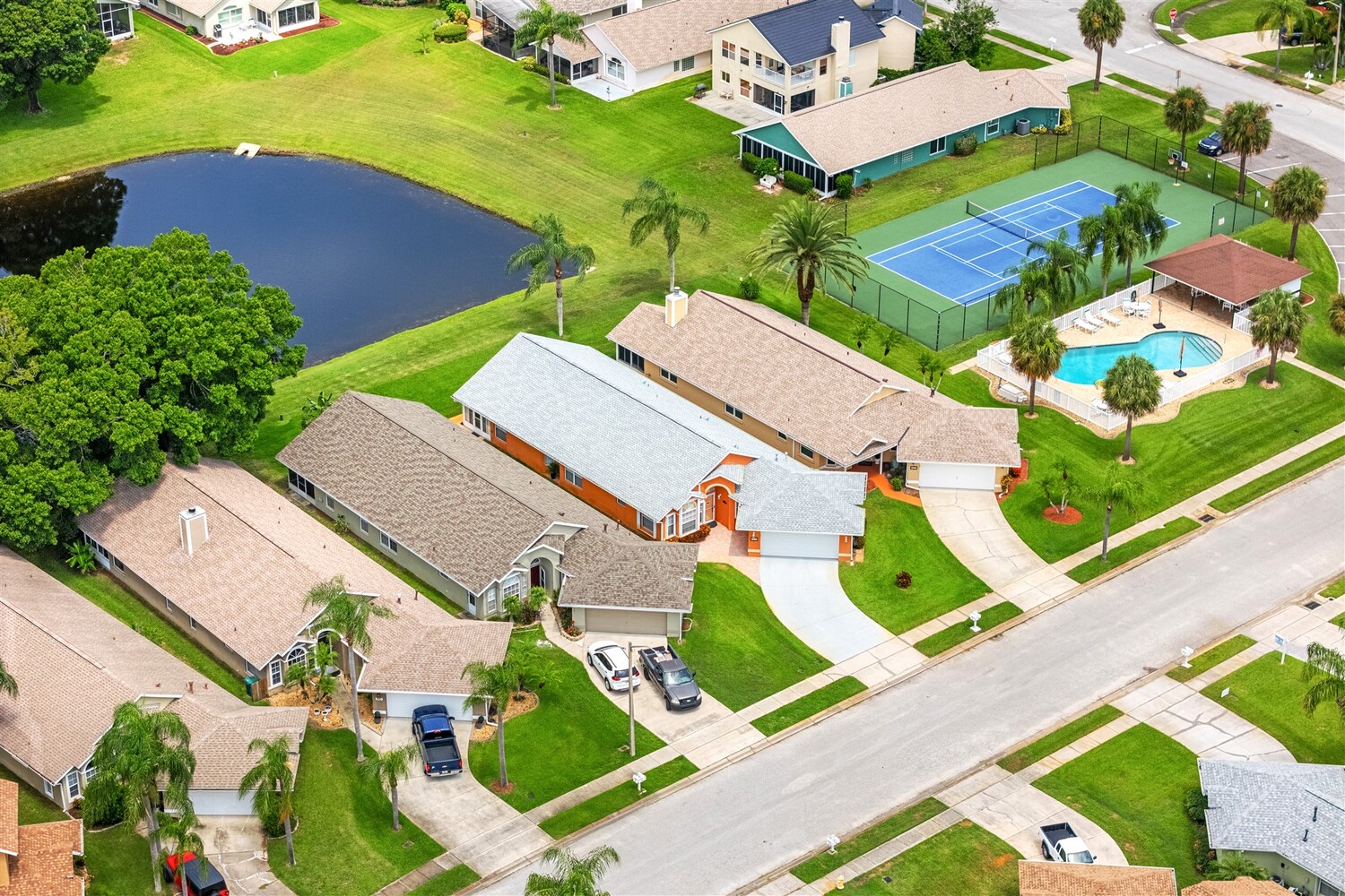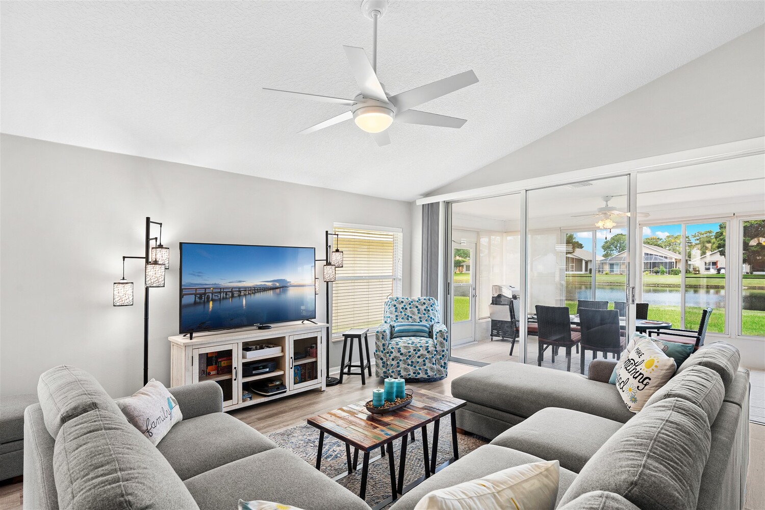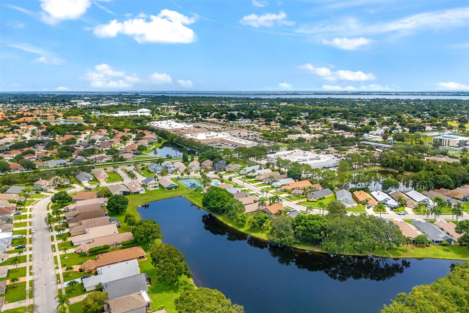 Meticulously cared-for lakefront 3-bed, 2-bath home boasting 1951 sq ft of living space, plus an additional 330 sq ft of enclosed airconditioned patio. The roof was installed and upgraded in 11/22 with retro fit single-wrap hurricane straps, ensuring durability and safety. A/C system was installed in 4/22. Bright, airy eat in kitchen with elegant white cabinetry and gleaming granite countertops. Open concept family room and dining room combo with 8 ft triple sliding glass doors provide ample natural light and gorgeous views of the lake. Large primary suite featuring a luxurious garden tub, separate shower, dual-sink vanity, and a spacious walk-in closet. Throughout the main living areas and bedrooms, vinyl plank flooring was installed in 2/22 adding a modern yet warm aesthetic while offering easy maintenance. Popcorn ceilings modernized with a clean knockdown texture. Nestled centrally in Melbourne, this home offers prime access to shopping and dining, many within