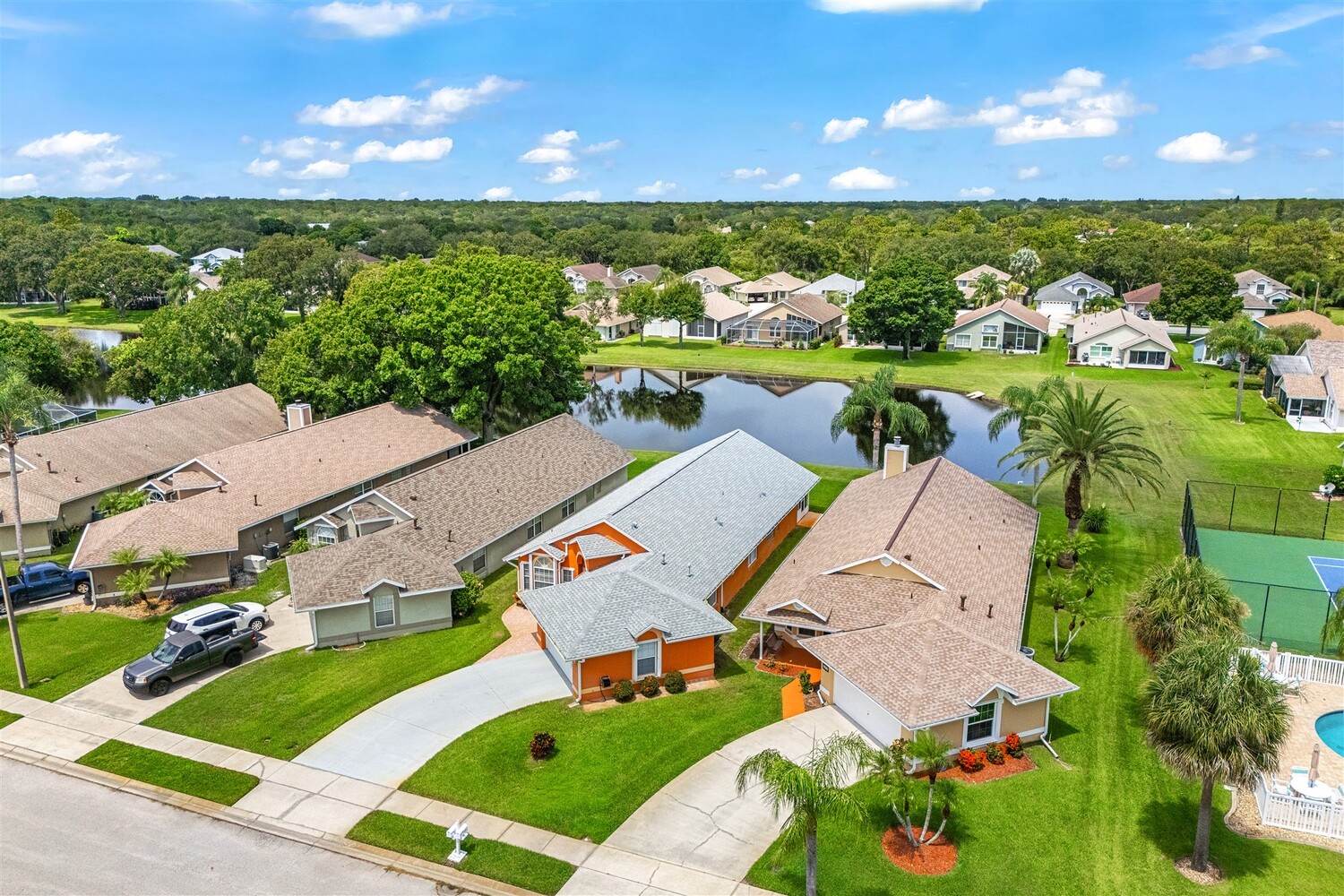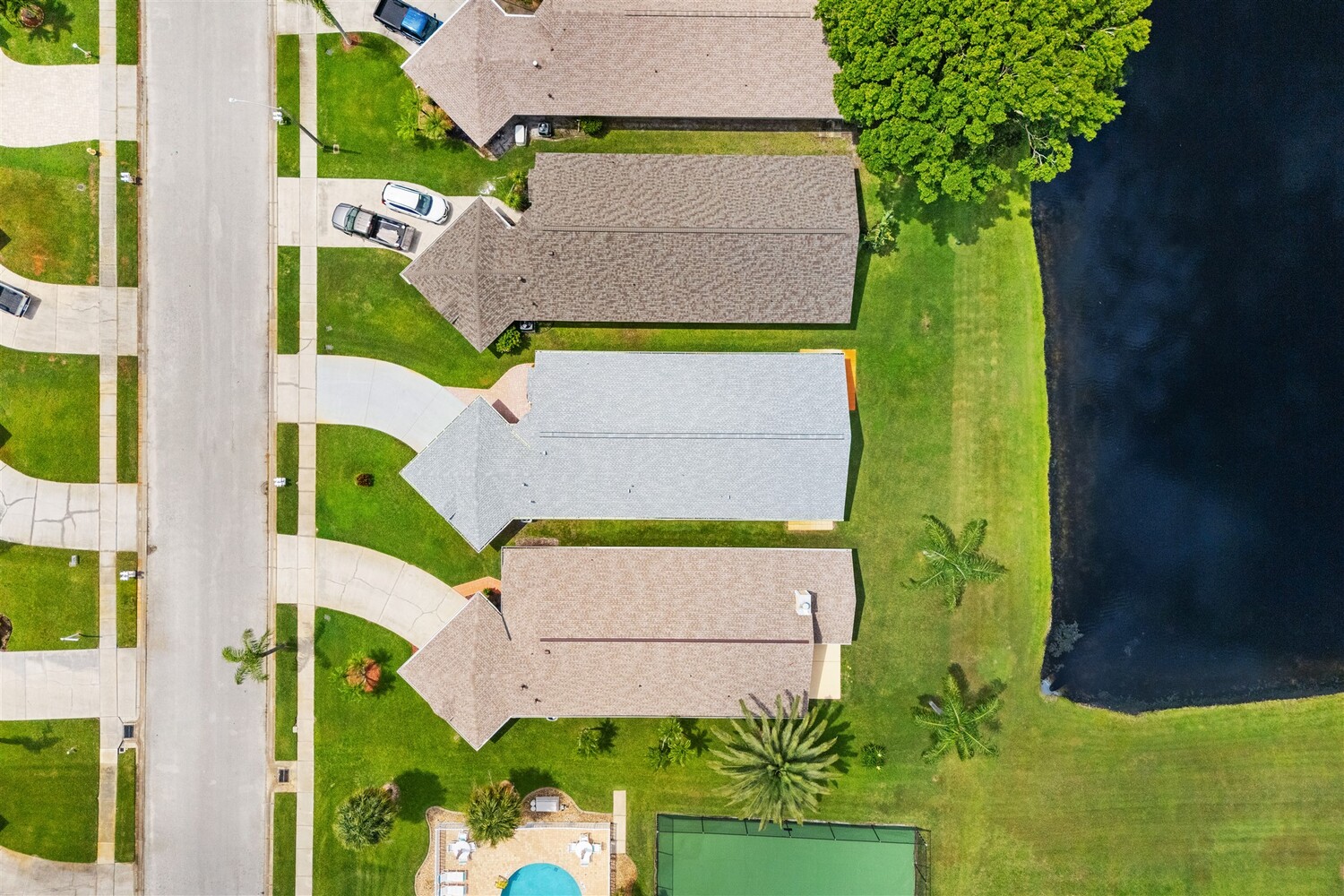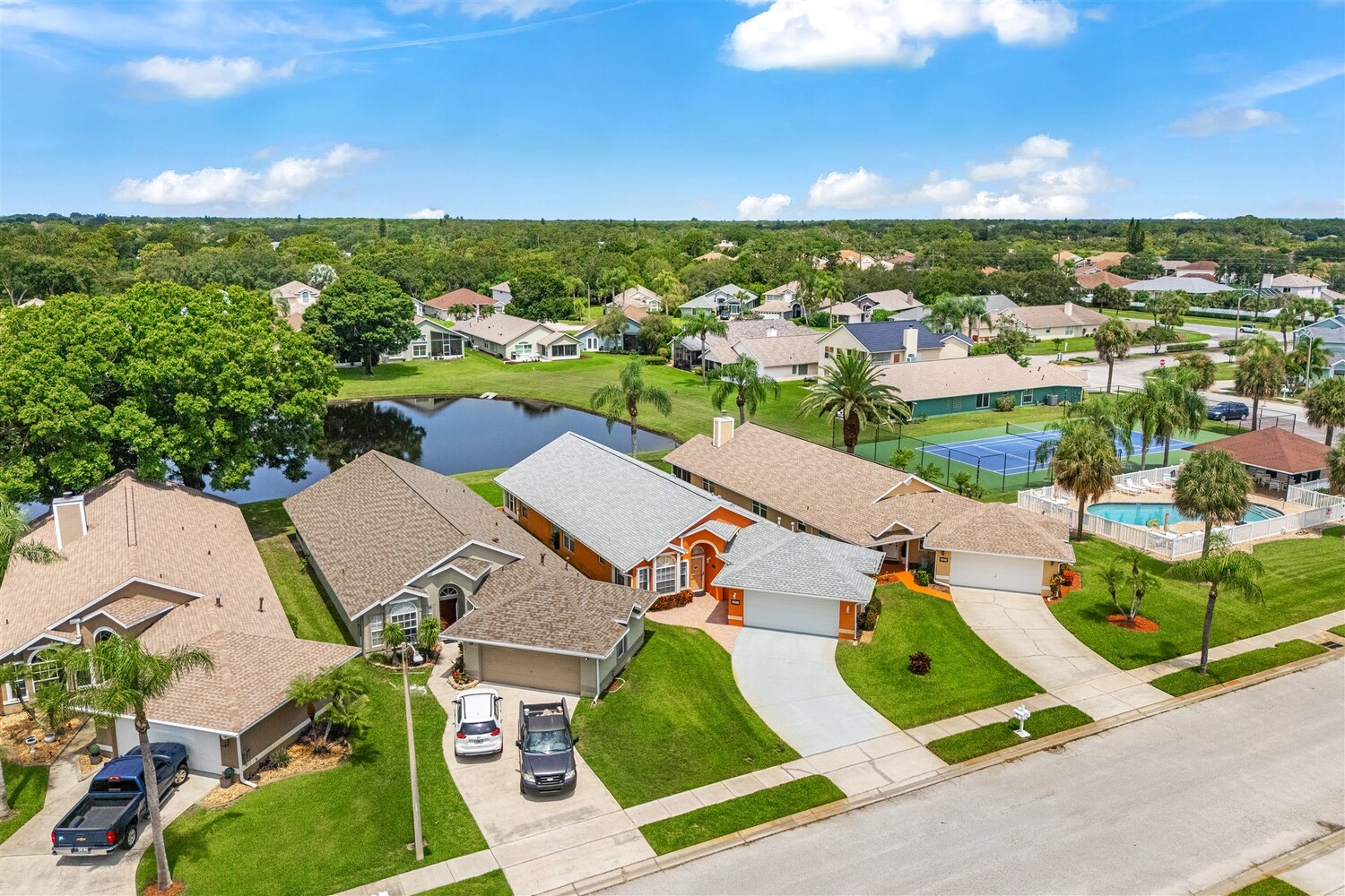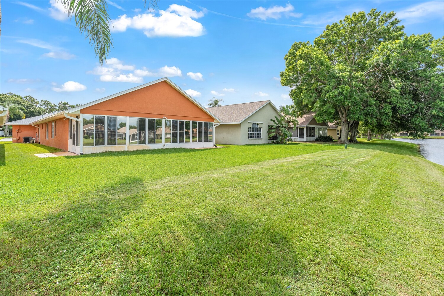 Meticulously cared-for lakefront 3-bed, 2-bath home boasting 1951 sq ft of living space, plus an additional 330 sq ft of enclosed airconditioned patio. The roof was installed and upgraded in 11/22 with retro fit single-wrap hurricane straps, ensuring durability and safety. A/C system was installed in 4/22. Bright, airy eat in kitchen with elegant white cabinetry and gleaming granite countertops. Open concept family room and dining room combo with 8 ft triple sliding glass doors provide ample natural light and gorgeous views of the lake. Large primary suite featuring a luxurious garden tub, separate shower, dual-sink vanity, and a spacious walk-in closet. Throughout the main living areas and bedrooms, vinyl plank flooring was installed in 2/22 adding a modern yet warm aesthetic while offering easy maintenance. Popcorn ceilings modernized with a clean knockdown texture. Nestled centrally in Melbourne, this home offers prime access to shopping and dining, many within