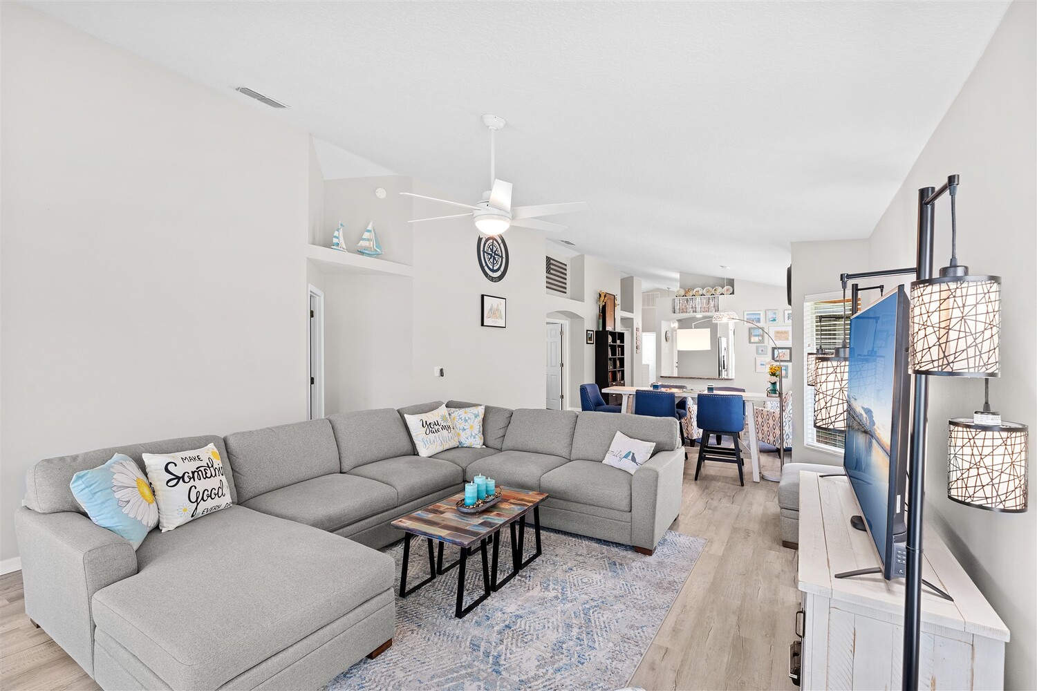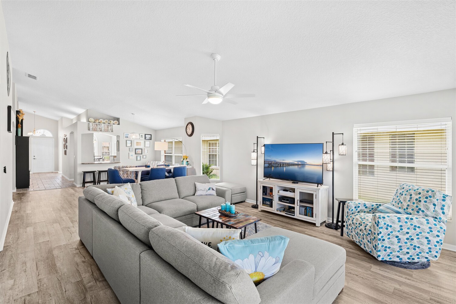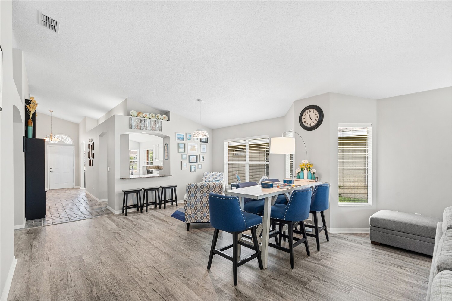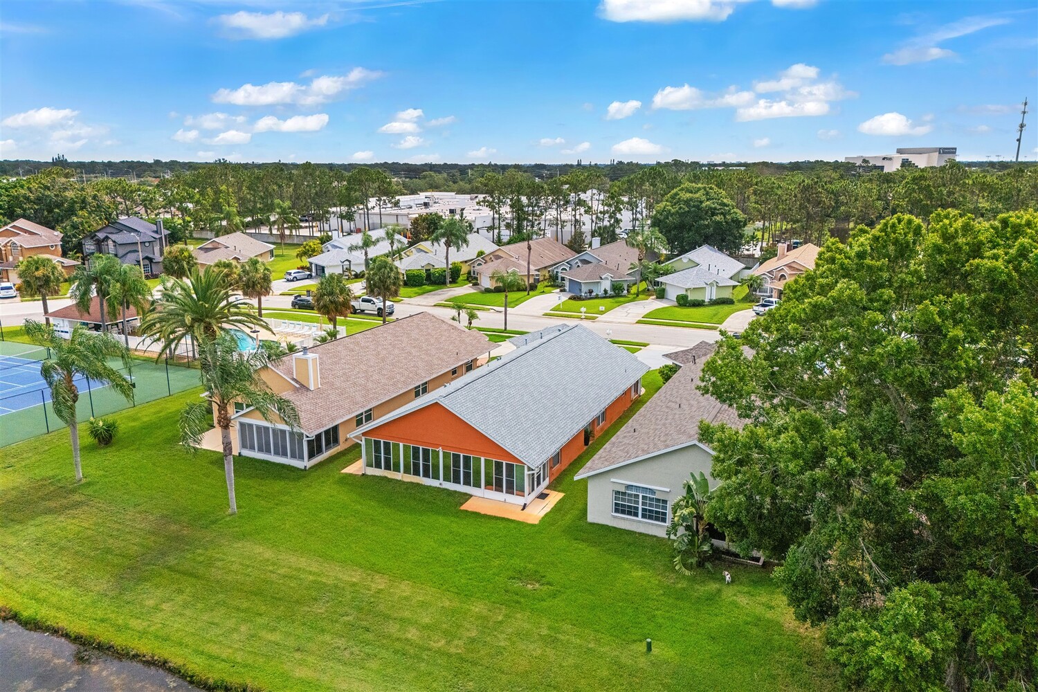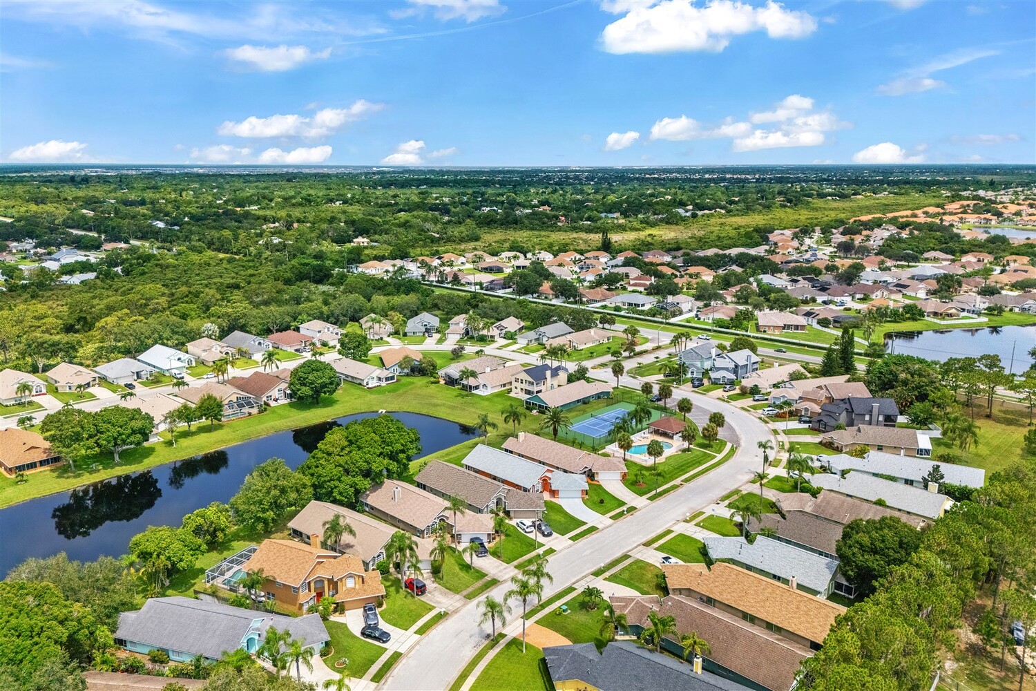 Meticulously cared-for lakefront 3-bed, 2-bath home boasting 1951 sq ft of living space, plus an additional 330 sq ft of enclosed airconditioned patio. The roof was installed and upgraded in 11/22 with retro fit single-wrap hurricane straps, ensuring durability and safety. A/C system was installed in 4/22. Bright, airy eat in kitchen with elegant white cabinetry and gleaming granite countertops. Open concept family room and dining room combo with 8 ft triple sliding glass doors provide ample natural light and gorgeous views of the lake. Large primary suite featuring a luxurious garden tub, separate shower, dual-sink vanity, and a spacious walk-in closet. Throughout the main living areas and bedrooms, vinyl plank flooring was installed in 2/22 adding a modern yet warm aesthetic while offering easy maintenance. Popcorn ceilings modernized with a clean knockdown texture. Nestled centrally in Melbourne, this home offers prime access to shopping and dining, many within
