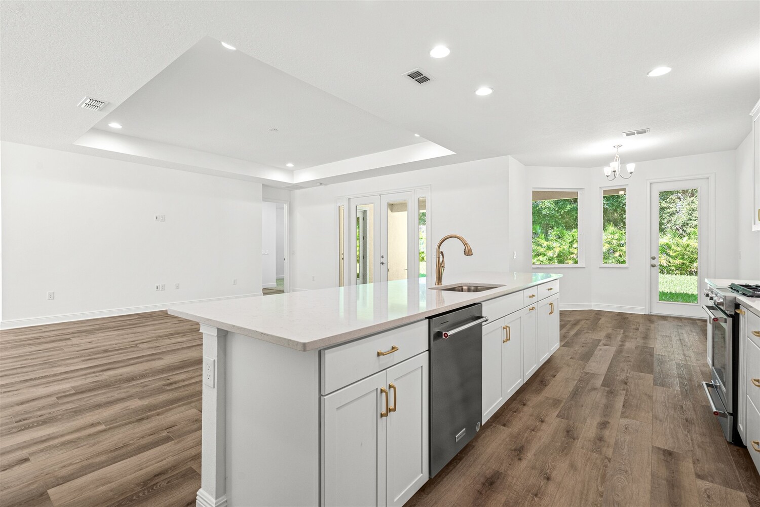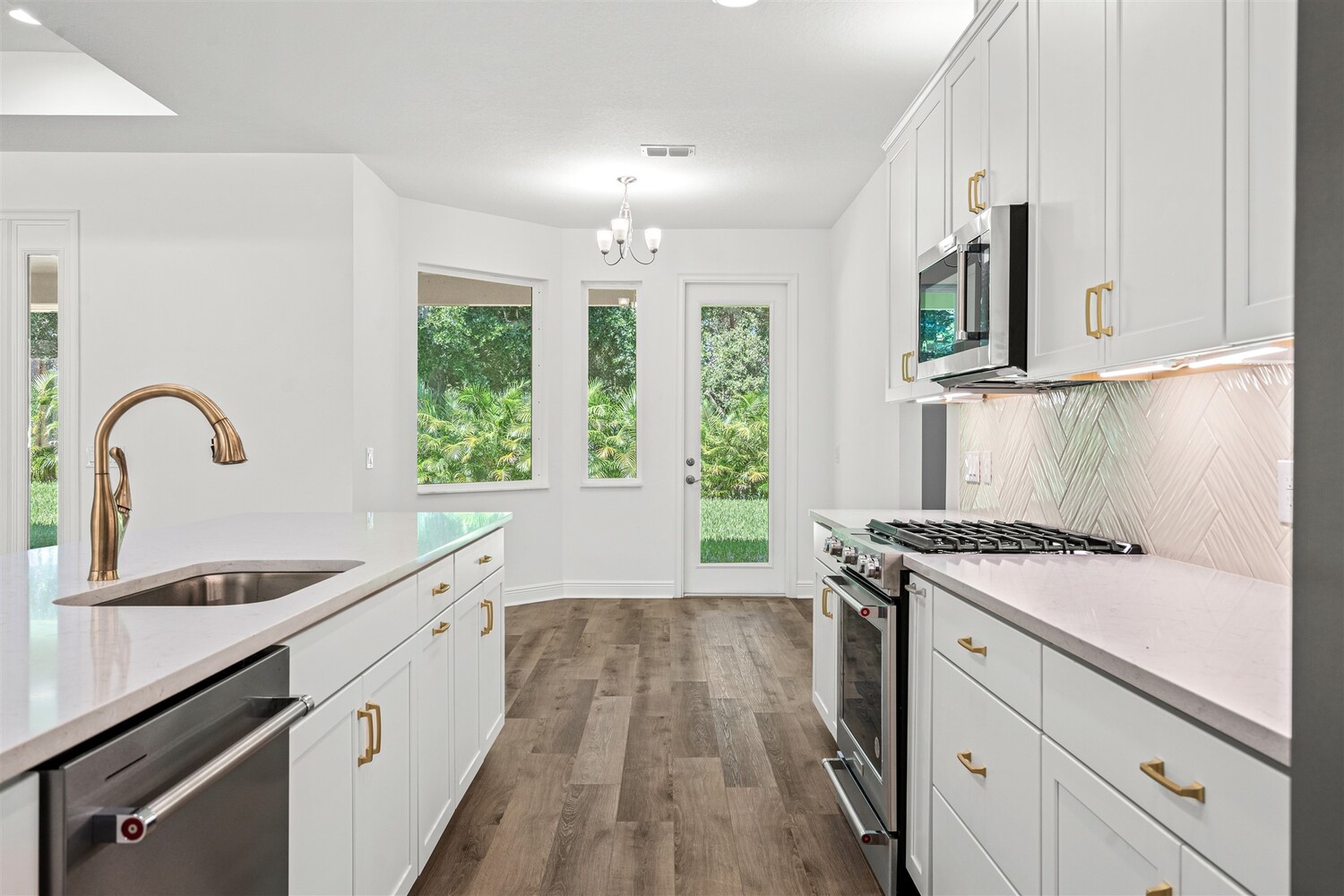 Newly constructed open concept home with designer chosen finishes. This 4 bedroom/3 bath/3 car garage boasts 2405 square feet of living space and 474 square feet of patio outdoor living space. Master craftsmanship coupled with expert designers and a central location make this home appealing for all. A generous sized trussed front porch leads to French leaded glass doors that reveal a living room and dining room combination. This space could be arranged as an office and dining room easily if that is your preference. Warm wood plank Lux Vinyl stretches throughout the living areas. The breakfast nook offers peaceful views overlooking the patio and the family room merges with the kitchen seamlessly. The counter height bar is covered with quartz and the cabinets are white and soft close. The hardware is brushed nickel and the appliances stainless steel. A center island and gas range top are additional upgrades. The Master Bedroom suite features a walk-in closet, linen closet, double vanity covered in quartz counters, 36" vanities in white, elegant tile shower that reaches to the ceiling, and private water closet. This split plan home has 3 other large bedrooms with upgraded carpets and 2 well-appointed bathrooms with one serving as the cabana bath. A laundry room situated between the kitchen and the 3-car garage completes this thoughtfully designed home. Outside a large covered back, the porch is equipped with a gas line ready for BBQs and the yard has ample space for a future pool. Located in Indian Riverwalk a unique gated community consisting of an intimate 8 home one street/cul-de-sac subdivision developed by one experienced builder. Therefore, the HOA dues will be low once it transitions to resident managed. It is located within walking to the high school, moments to the Indian River, a short ride to Cocoa Village, and the pristine white shores of the Atlantic Ocean.