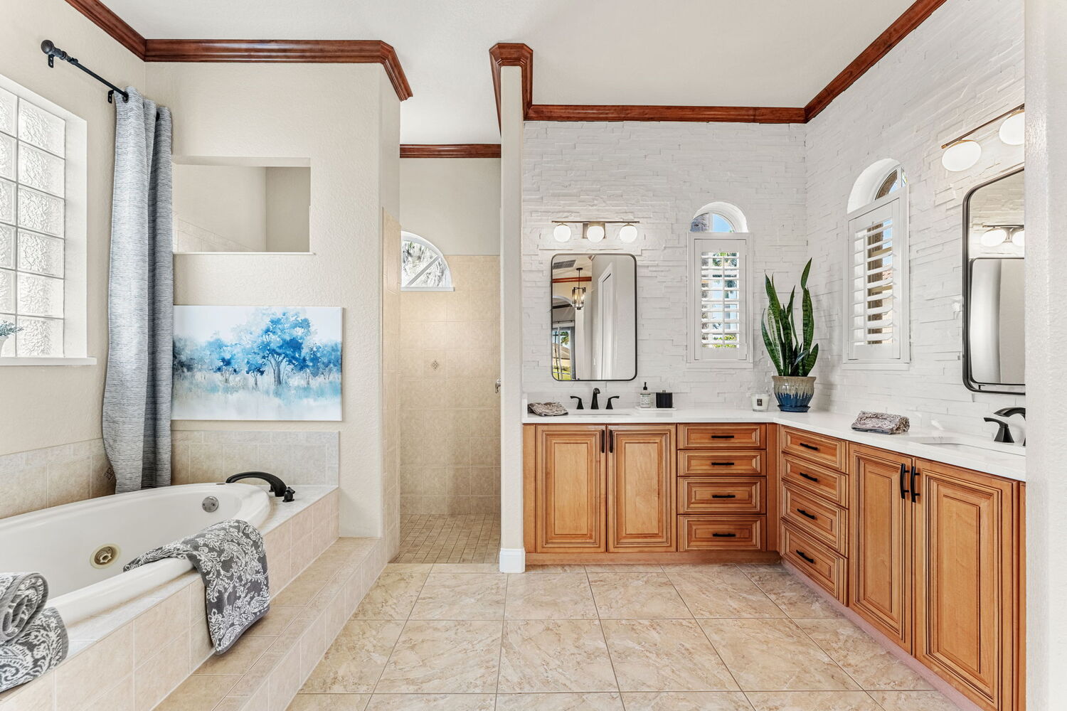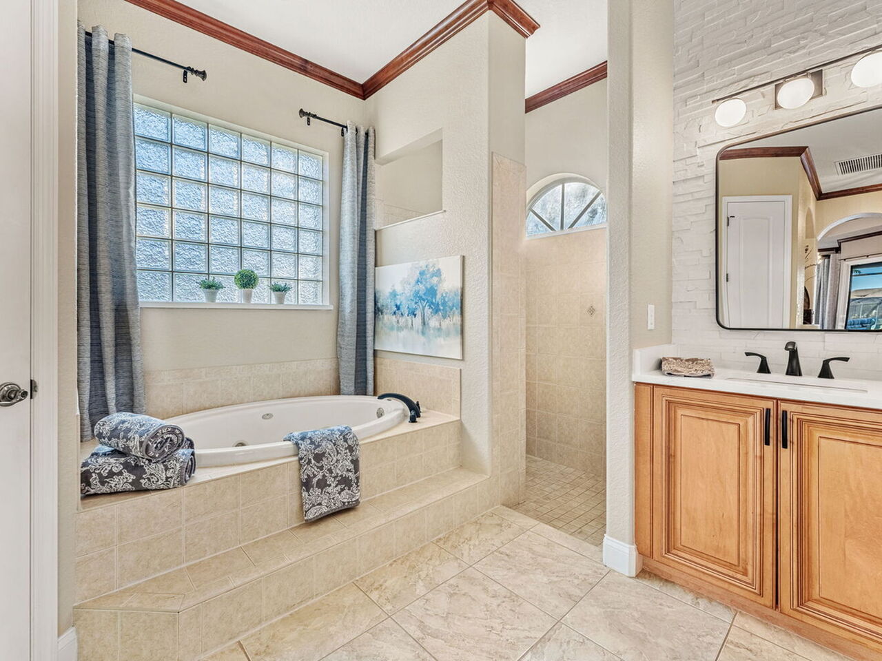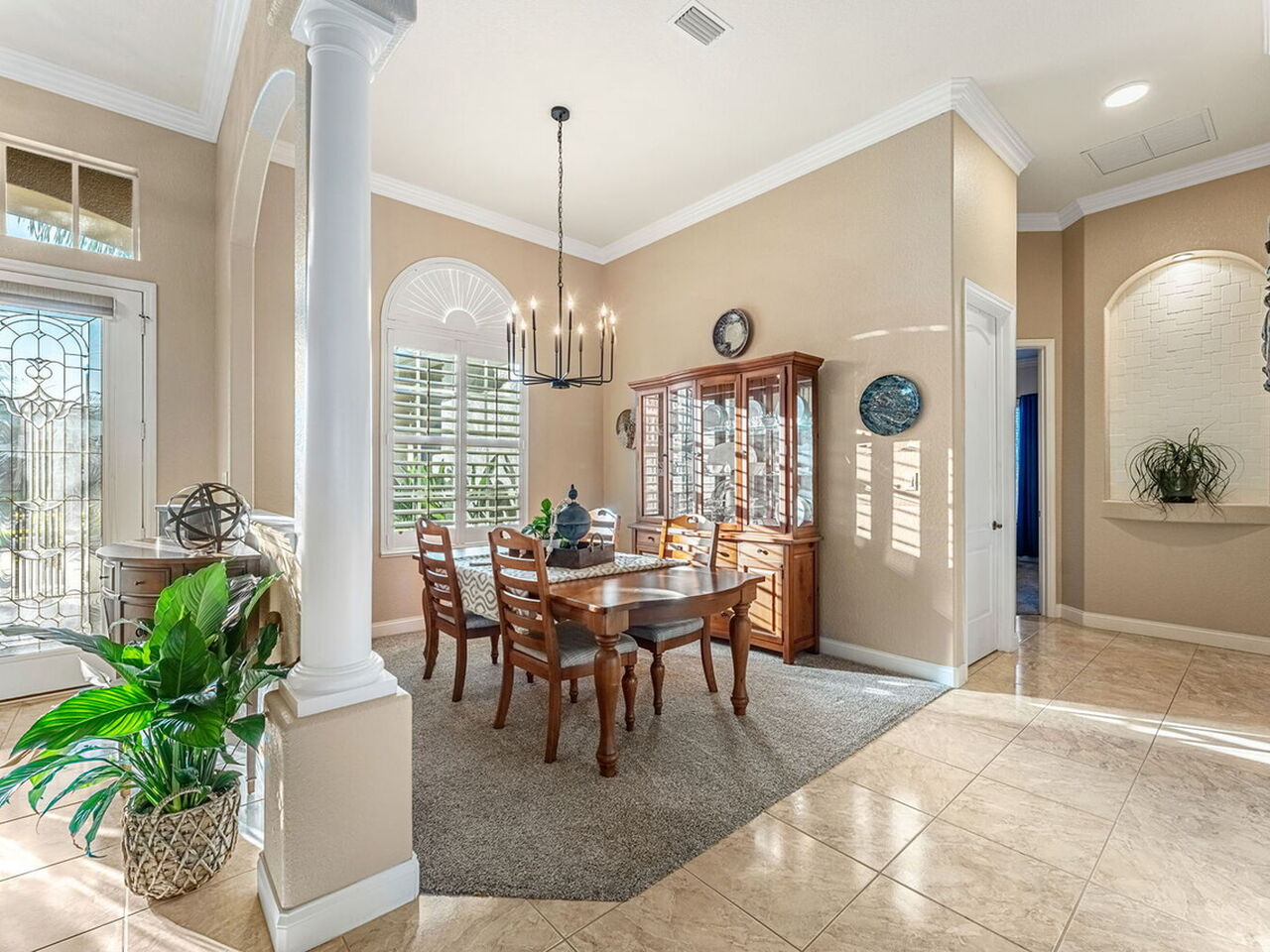 ENJOY THE ZEN of relaxing water views from your expansive outdoor entertainment space in this custom-built home. Located in prestigious and gated Charolais Estates, this home is freshly updated for on-trend sophistication: gleaming white quartz countertops in the kitchens and baths; new designer backsplash and kitchen sink; and new matte black light fixtures, faucets, and hardware complete this move-in ready beauty. Upon entering, you can't miss the airy water views from the living room slider and nearby dining room off the large kitchen area and great room with another slider. The kitchen is a chef's dream with plenty of cabinets and counterspace, a large walk-in pantry, brand new stainless-steel SMART Refrigerator and Range with Air Fryer, plus newer Dishwasher and Microwave. The adjoining breakfast nook has charming built-in banquet seating and cabinetry, and sunny butted glass windows - - perfect for relaxed gatherings. The spacious and private primary suite is accessed thru impressive double doors and offers a relaxing retreat with separate martini nook, lanai access and tray ceiling; and a spa-like bath with dual sinks, luxurious jetted tub, walk-in shower, and plenty of cabinetry for storage; and two spacious closets with built-in closet systems. On the opposite side of the home are spacious bedrooms 2 and 3 sharing a full J&J bath, and separate bedroom 4/flex room with adjacent full bath near access to the lanai. Extensive crown moulding, window treatments, extra storage closets, plus a large laundry room complete the living space. Sitting on a roomy .29 acre executive lot, the home offers extra parking on the extended driveway plus a side-load 3-car garage outfitted with a work sink, plenty of storage shelves and workbench. 2023 roof check-up; 2021 HWH, and 2018 HVAC replacement with Carrier 5 Ton unit. Excellent Viera location near shopping and dining at Borrows West, The Avenue, and gourmet Publix; plus easy access to I-95 for major employers, Orlando, and the beaches.
