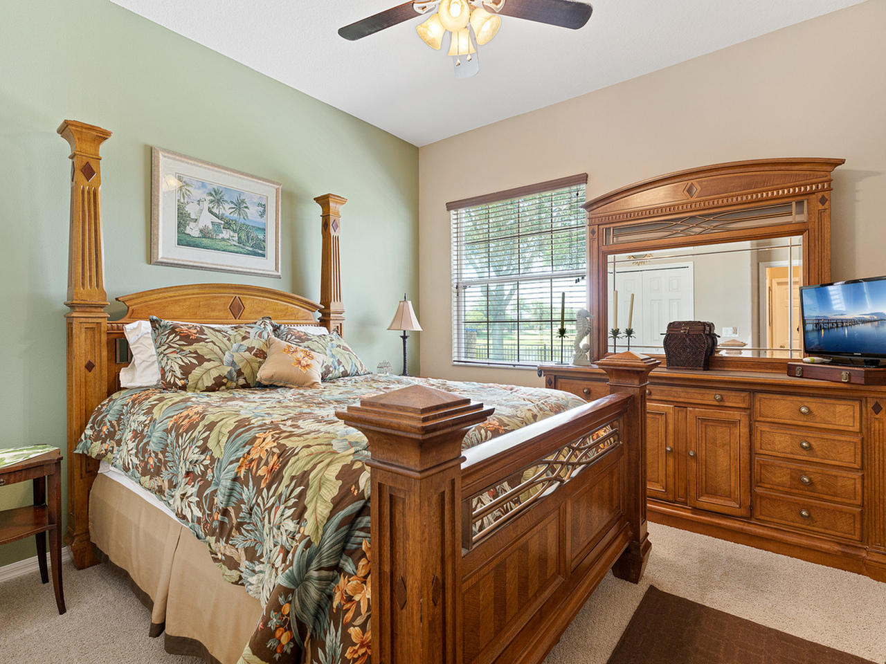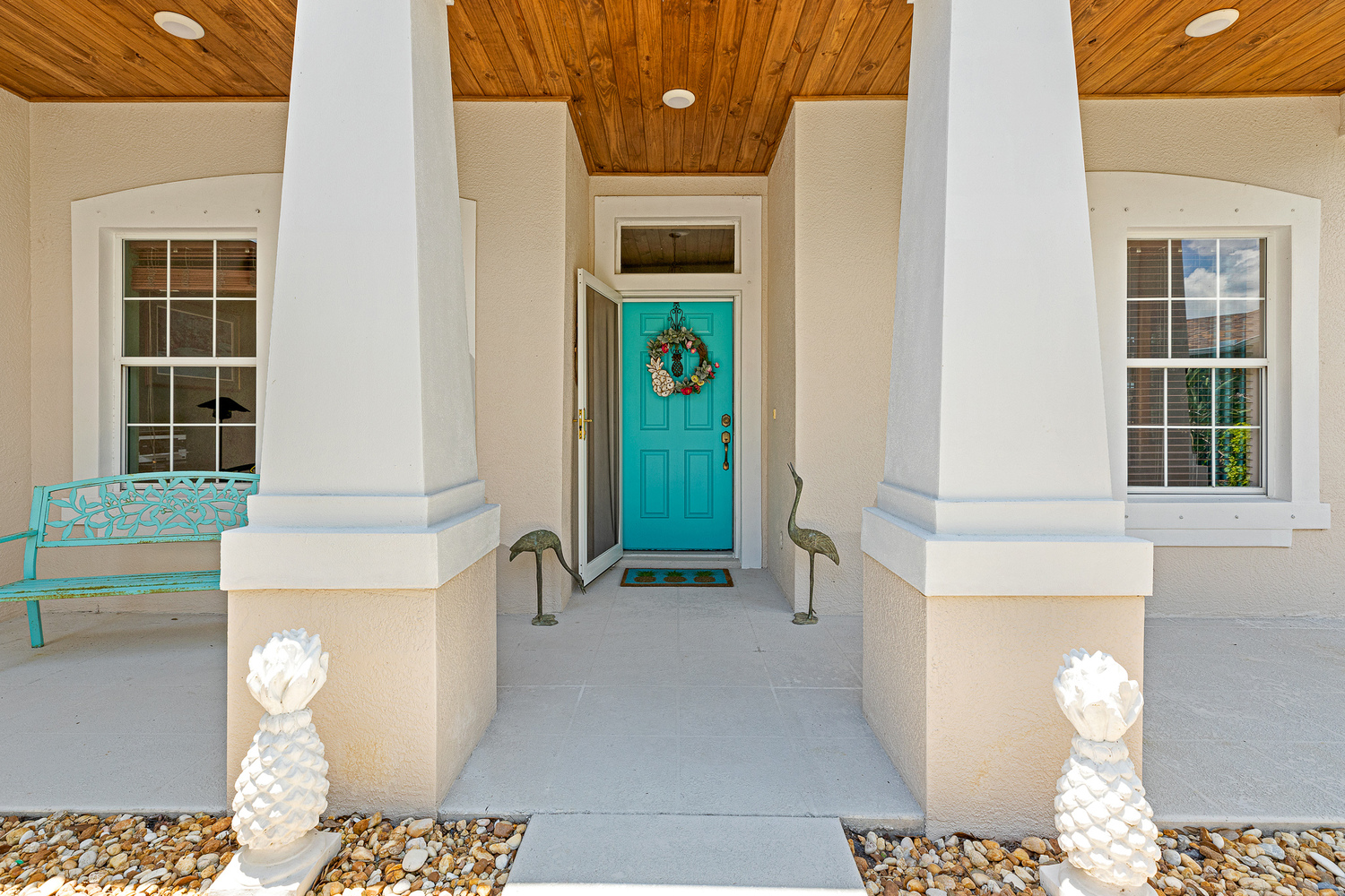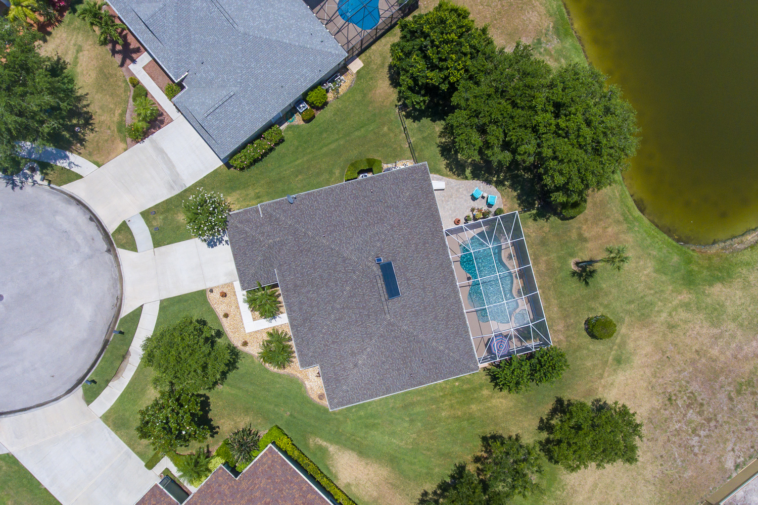 Indigo Crossing Waterfront, Pool Home on a Cul-De-Sac with 3Bdrm/2Bath+Den. Situated on a V-shaped lot that stretches wide in the rear where a freshly painted patio is enclosed with a screened beautifully landscaped pool and waterfalling hot tub. The covered portion is adorned with Tongue and Groove in natural wood tones that match the welcoming front porch. The patio extends past the screen enclosure where sprawling trees shade the yard and create a serene spot over the water. The foyer, kitchen and family room is in a neutral tile, hardwood floors in the Master Bedroom and Office. 9'4'' Ceilings, Crown Molding, Stainless Steel Appliances, Washer/Dryer, Granite Counters New ROOF, New 16 Seer A/C, New 50 Gallon Tank Solar Water Heater, New Solar Attic Vent, and Newer Pool Pump,