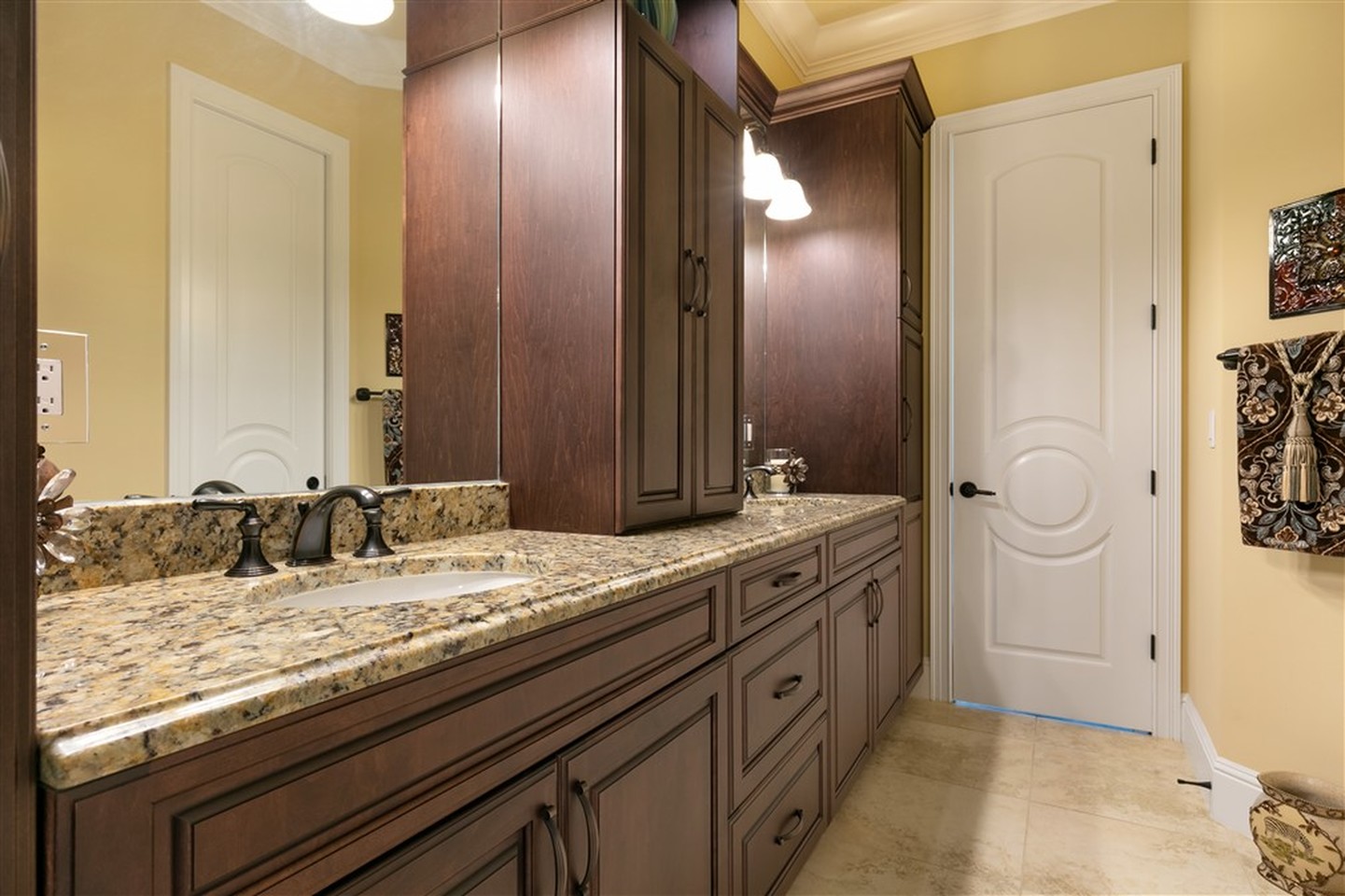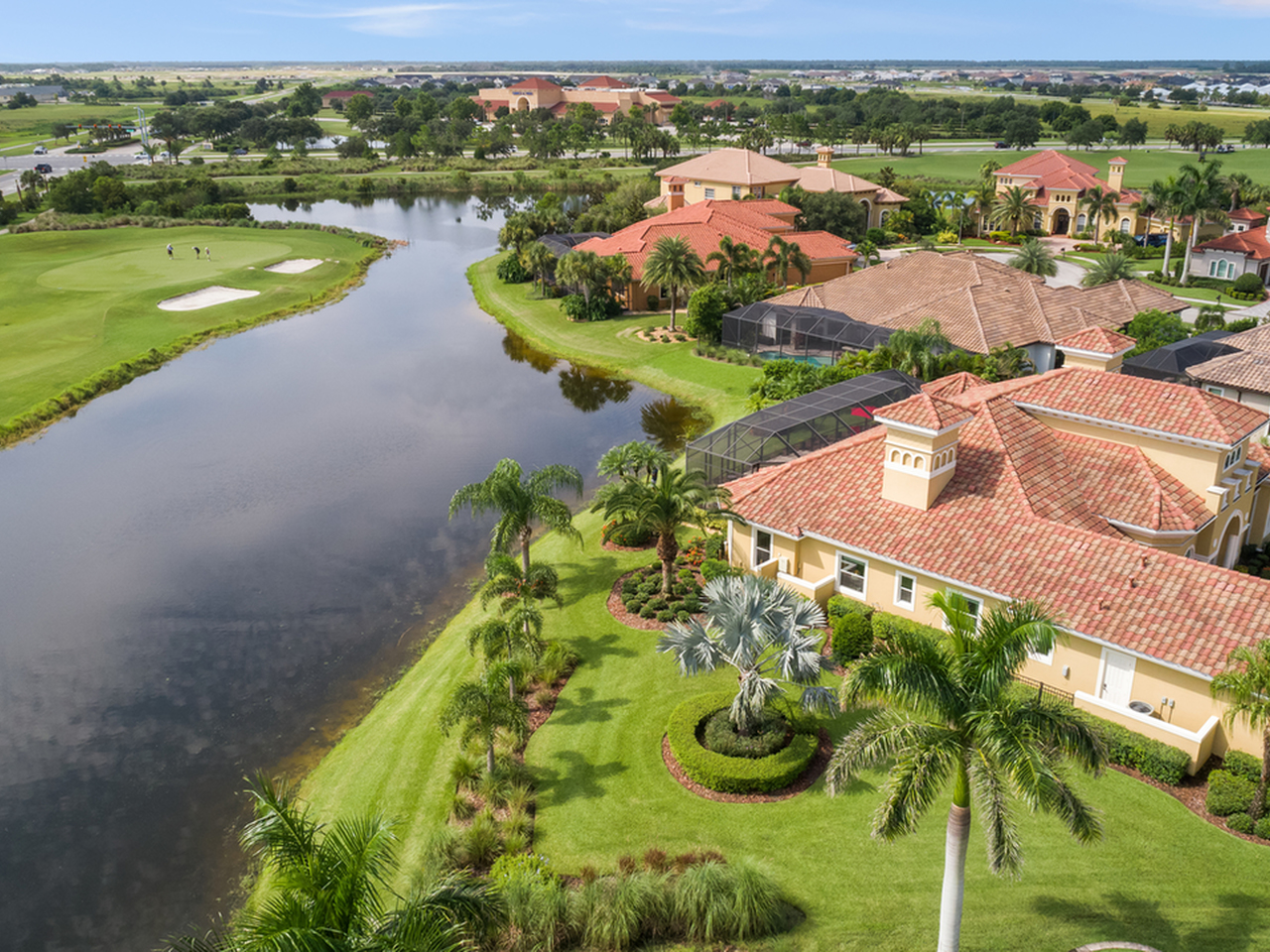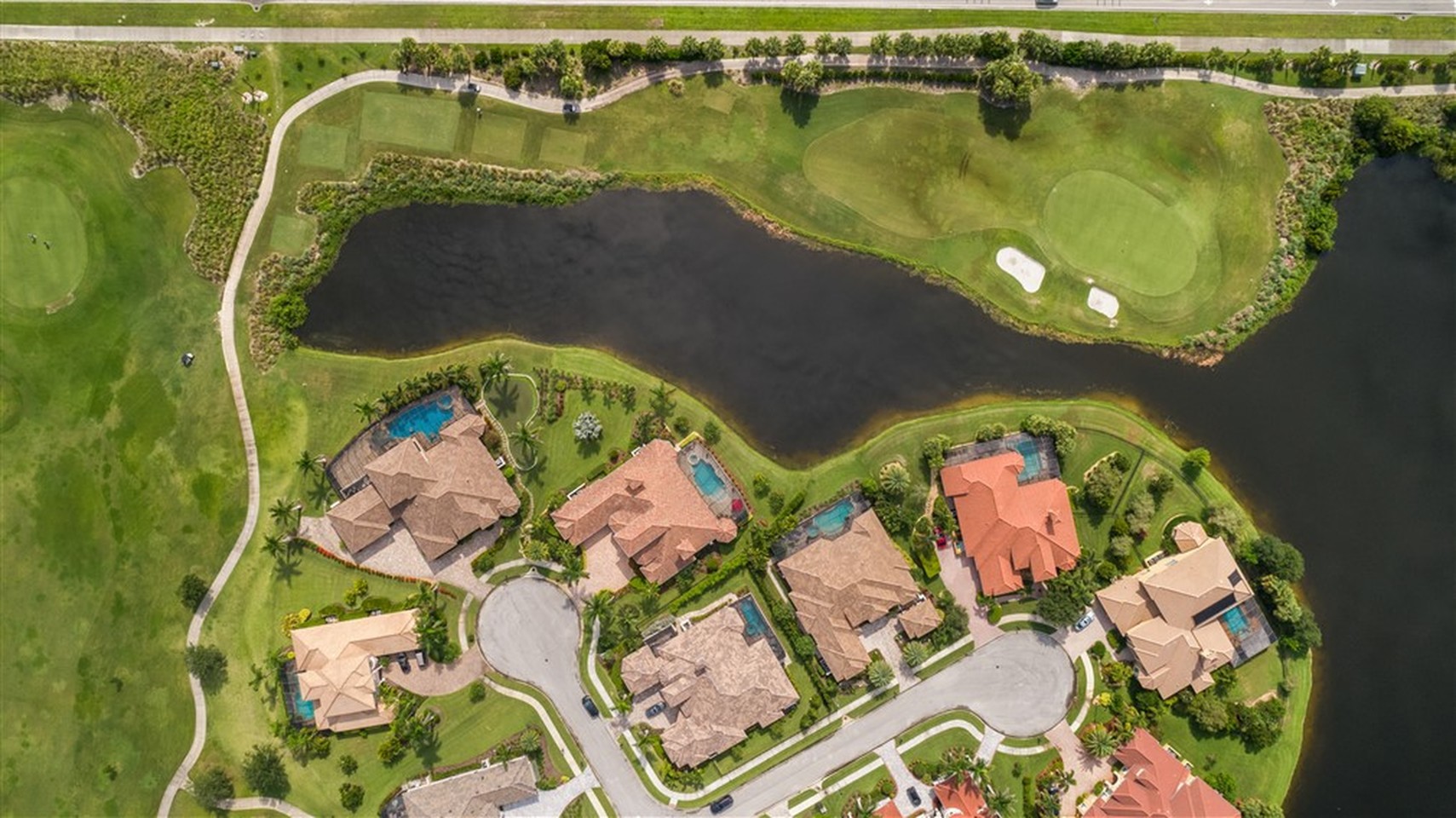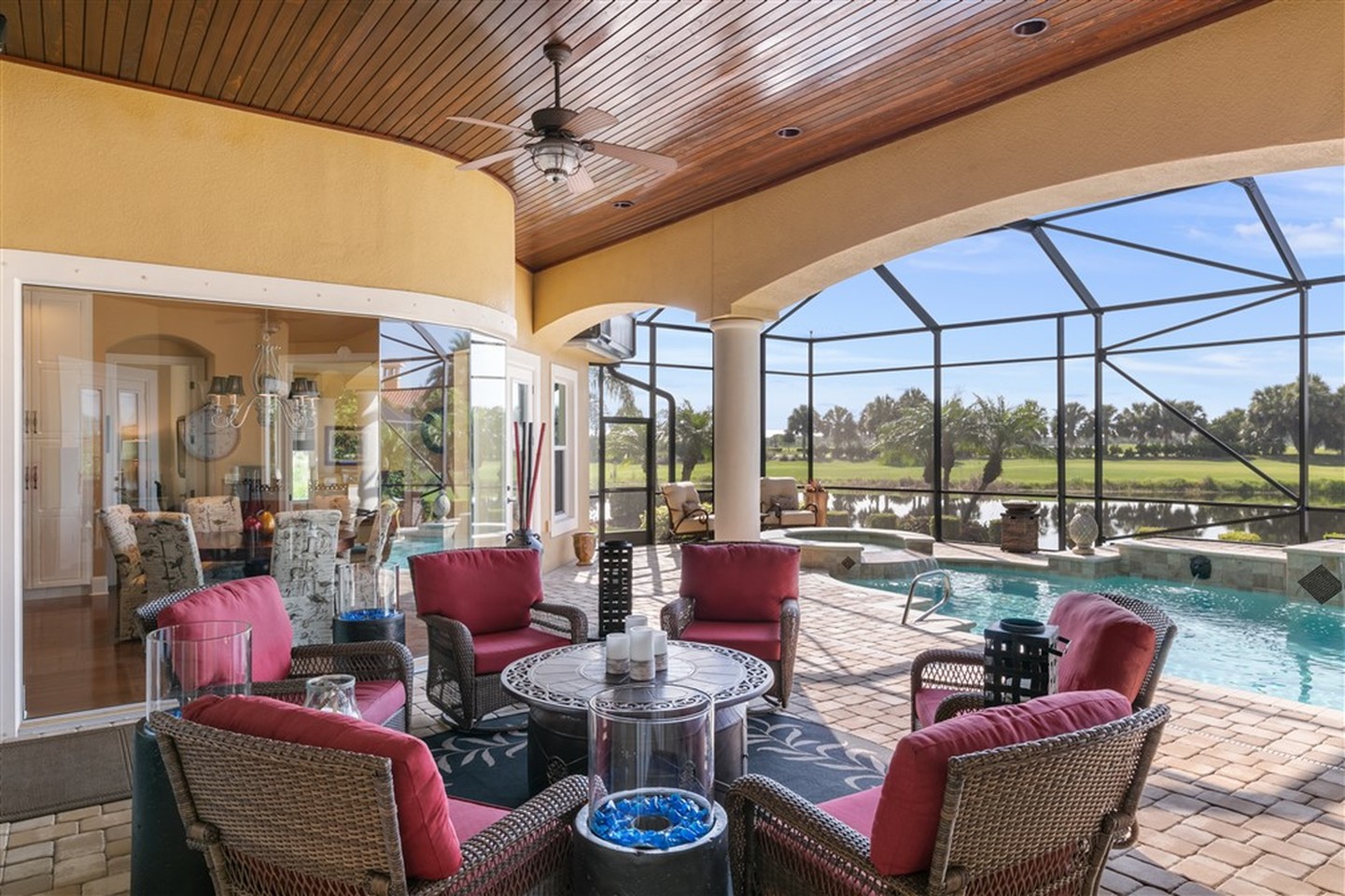 Built in 2013 by a premier luxury builder, this 3572 square foot home is situated on an exceptional, lakefront, .42-acre, lot within Viera's discerning, gated golf community of Wyndham at Duran. Elegant and thoughtful touches are found throughout this home. Stunning architectural details such as arched windows, pillared entryway with a 2 story roofline, corbels, custom crafted Cantera iron double doors and a lovely tropical landscape set the stage for the opulence that lies within. The desirable and current Great Room plan offers an open living concept while still offering defined dining, kitchen and living spaces. A triple tray ceiling, a cypress lined coffer ceiling, triple sliders surrounded by wood trim and topped with paneled transom windows, a gorgeous cast stone fireplace flanked by recessed, lighted niches with custom cabinetry and shelving create a dramatic statement. Located just steps away is the home's walk in wine room lined with brick walls and who's wrought iron gate is a custom piece of artwork. The home's kitchen is one enviable living and entertaining space. Outfitted with timeless white-painted cabinetry, offset by a black, granite topped island with vegetable sink, and black custom range hood, eye catching tumbled marble backsplash with convenient pot filler, a 21-foot breakfast bar and bringing it home with a $35K Thermador Professional appliance package. A statement making, floor to ceiling curved butted glass window provides the backdrop to the breakfast nook. Enjoy morning coffee while taking in the wonderful vistas of the lanai's pool and lake beyond. Triple sliders from the Great Room provide access to the screened lanai and their pocket capability blur the line between in and outdoor spaces. You'll find plenty of covered space under the cypress ceiling for the occasional rainy day and a very cool, octagon shaped, pool side cabana with a fully equipped summer kitchen and bar will beckon guests and family alike. More curved butt glass in found in the Master suite offering pool and lake views. Triple stacked tray ceilings and gorgeous sculptured carpet provide a refined but casual relaxing space. Travertine is found in the master bath along with warm wood cabinetry housing his and her sinks, a soaking tub and a lovely tiled walk in shower surrounded by frameless glass. A home office, bonus/media room and laundry room with custom dog wash station round out the remainder of the home. Numerous upgrades and accents inside and outside the home include low E impact windows and doors, storm panels for aquarium glass windows, radiant barrier, custom window treatments and shutters, 8 foot raised panel solid core doors, external recessed lighting and downlights, recirculating hot water pumps, Kohler brand sinks and hardware, EMTEK door hardware and more. Live the life every day in this elegant, yet casual, custom dream home.
