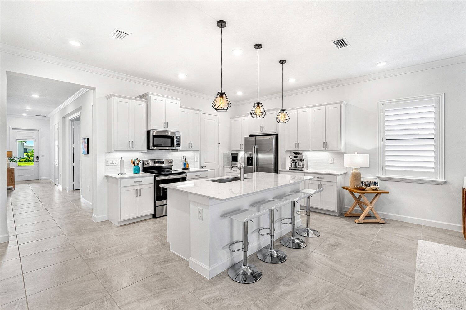 Stunning, two-year-old, 3 bedroom plus study, 3 1/2 bath, waterfront home in Bridgewater, Viera's popular gated 55+ resort style community. All three bedrooms are en-suites, making the Key Largo the most coveted floorplan! This meticulous, barely lived in home is loaded with extras including IMPACT WINDOWS and SLIDERS, plantation shutters and crown molding throughout, tile floors (no carpet!), screened lanai, luxury bath package, LED's in all bedrooms and great room, ceiling fans, pendent lights and 8' doors. Other ''must haves'' include white kitchen cabinets w/glass tile backsplash, quartz counters in kitchen & baths, and laundry room cabinets! Storage galore with 8 closets, plus a walk-in pantry and a 20'X21' garage! Owner added $13,000 in additional landscaping to enhance this impeccable lake front home! Truly turnkey! May also be sold furnished at an added cost. Unbelievable clubhouse w/ heated pool and spa, movie theater, fitness center, coffee lounge, tennis & pickleball.