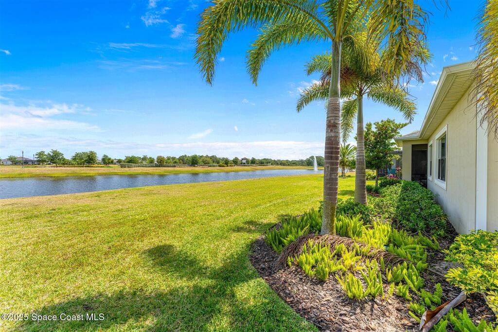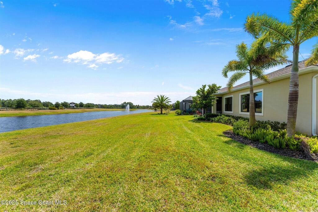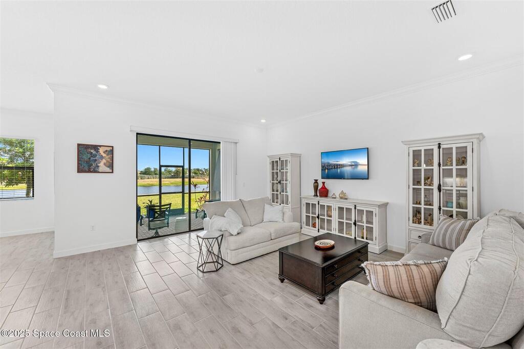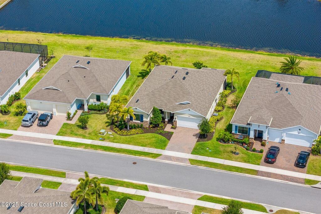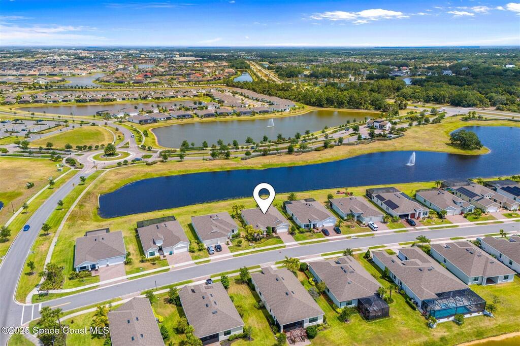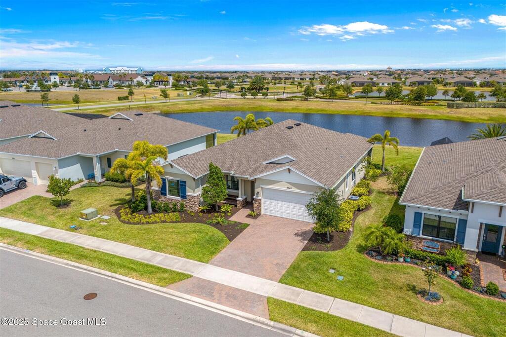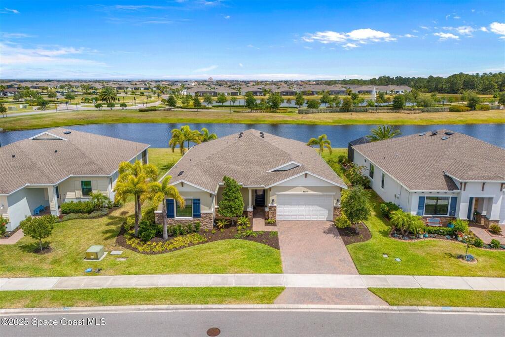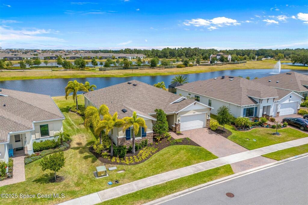 A must-see, this former builder's model with mother-in-law suite (ADU) attached, has all the extras! Situated on a waterfront lot with added landscaping, the next-gen floorplan in Bridgewater, Viera's popular 55+ resort style community, features a separate living suite with private entrance, kitchen and laundry, family room, full bath and bedroom and is perfect for an office, in-laws, and grown children. This beautifully decorated home with 3 additional bedrooms, 2 baths and a flex room, features plank tile throughout with color sealed grout adding beauty and ease of cleaning. The stunning gourmet kitchen features wall oven, a cooktop, designer hood, tiled backsplash w/ undercabinet lighting, pantry and a huge island! Crown molding and additional LED lighting in all rooms! Enjoy relaxing on the stone-faced front porch or on the screened lanai overlooking the lake and fountain! State of the art clubhouse with heated pool, spa, tennis, pickleball! Close to beaches! HOA maintains yard!