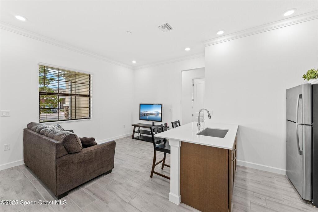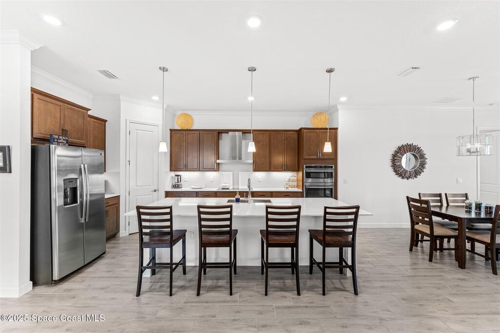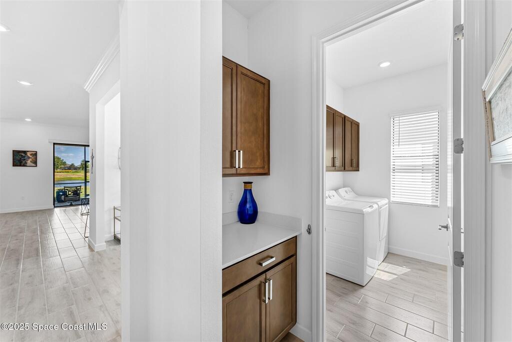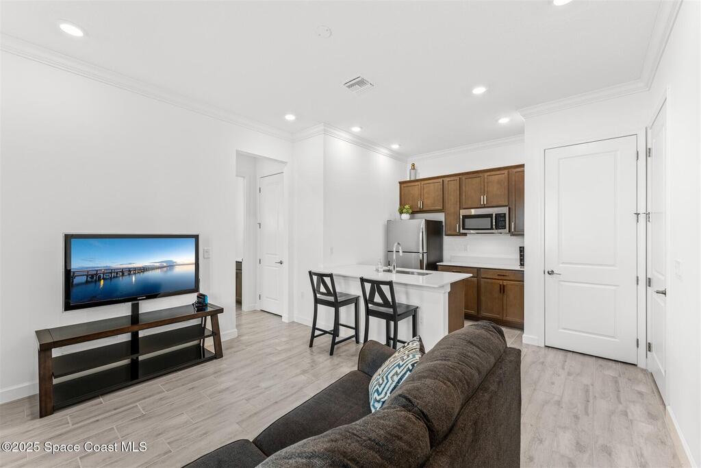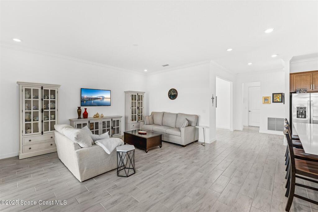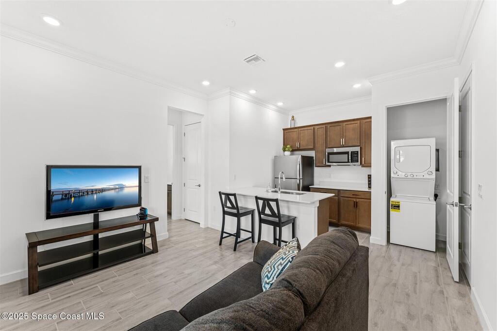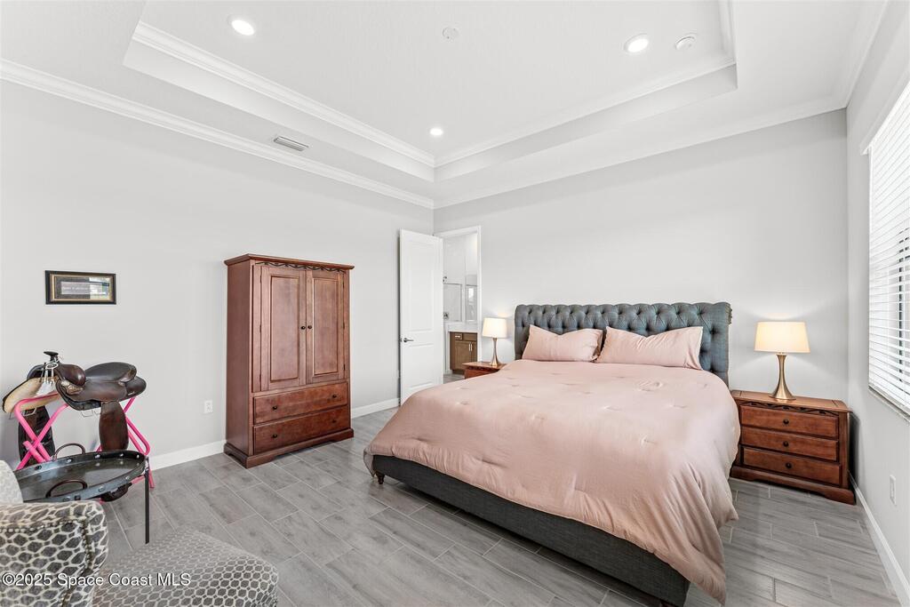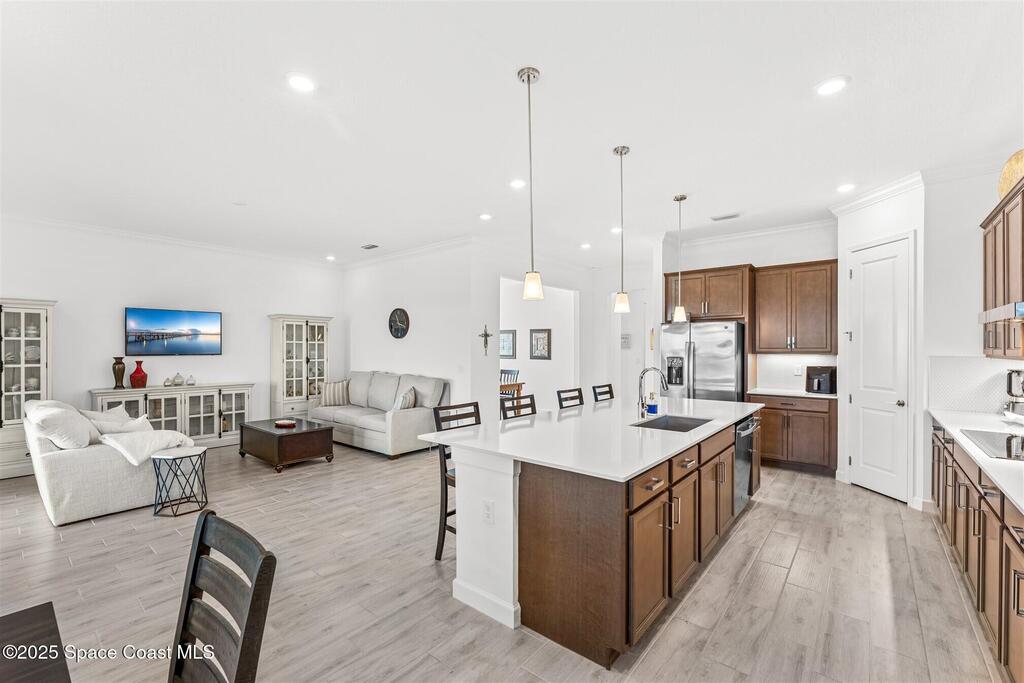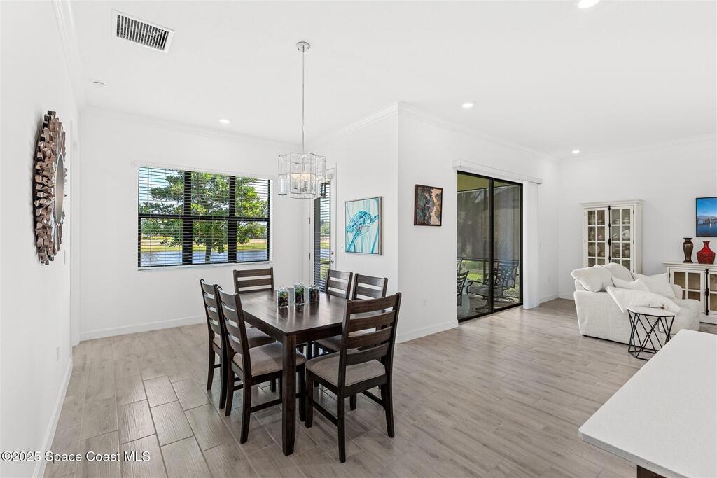 A must-see, this former builder's model with mother-in-law suite (ADU) attached, has all the extras! Situated on a waterfront lot with added landscaping, the next-gen floorplan in Bridgewater, Viera's popular 55+ resort style community, features a separate living suite with private entrance, kitchen and laundry, family room, full bath and bedroom and is perfect for an office, in-laws, and grown children. This beautifully decorated home with 3 additional bedrooms, 2 baths and a flex room, features plank tile throughout with color sealed grout adding beauty and ease of cleaning. The stunning gourmet kitchen features wall oven, a cooktop, designer hood, tiled backsplash w/ undercabinet lighting, pantry and a huge island! Crown molding and additional LED lighting in all rooms! Enjoy relaxing on the stone-faced front porch or on the screened lanai overlooking the lake and fountain! State of the art clubhouse with heated pool, spa, tennis, pickleball! Close to beaches! HOA maintains yard!