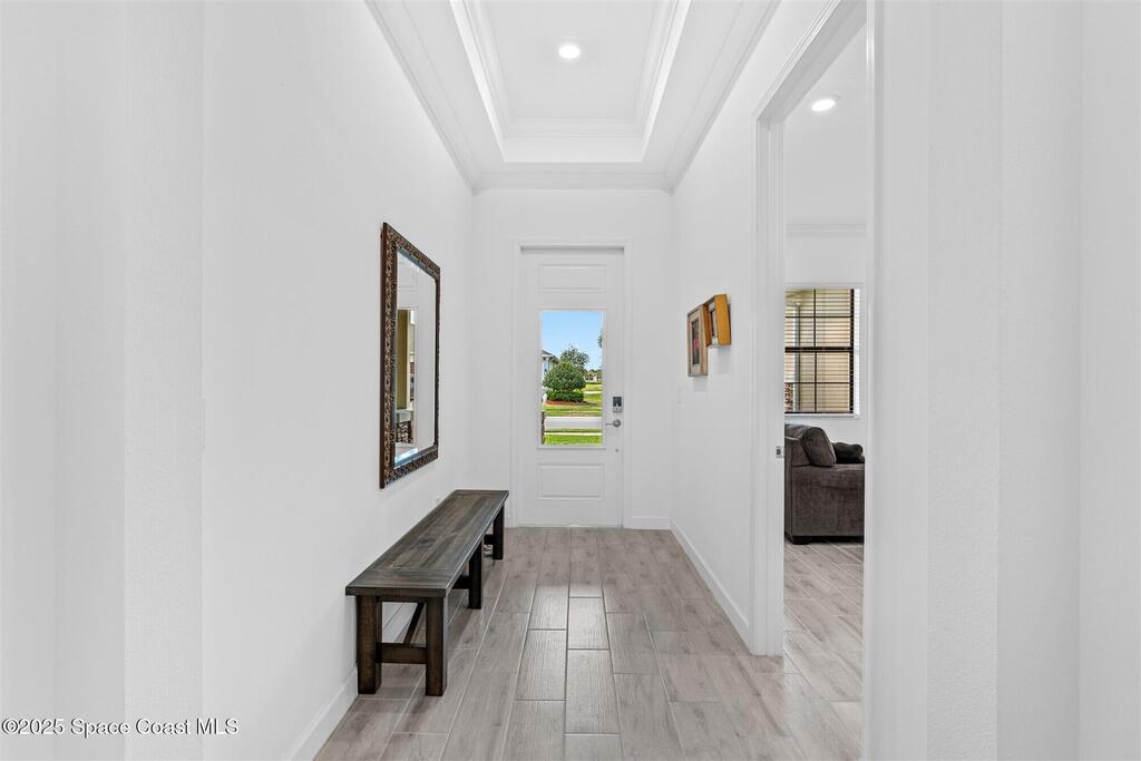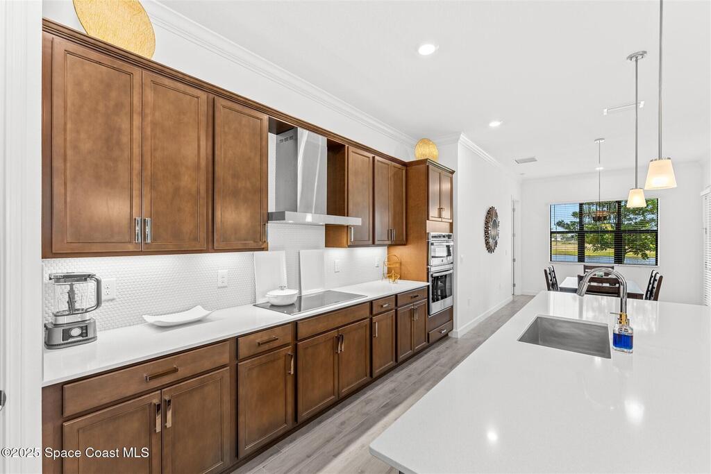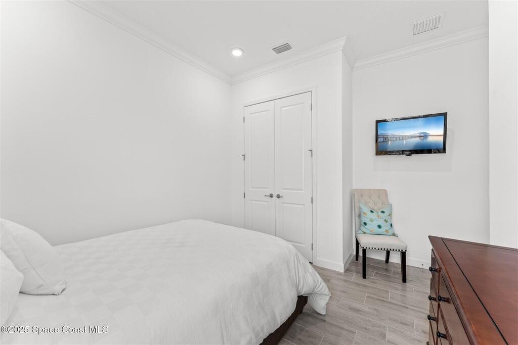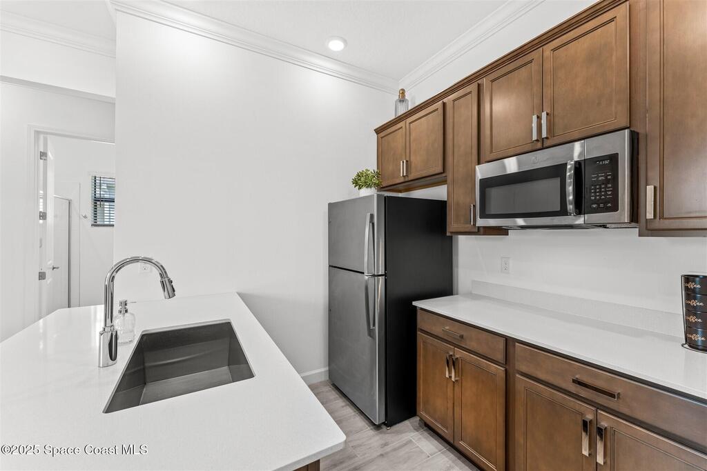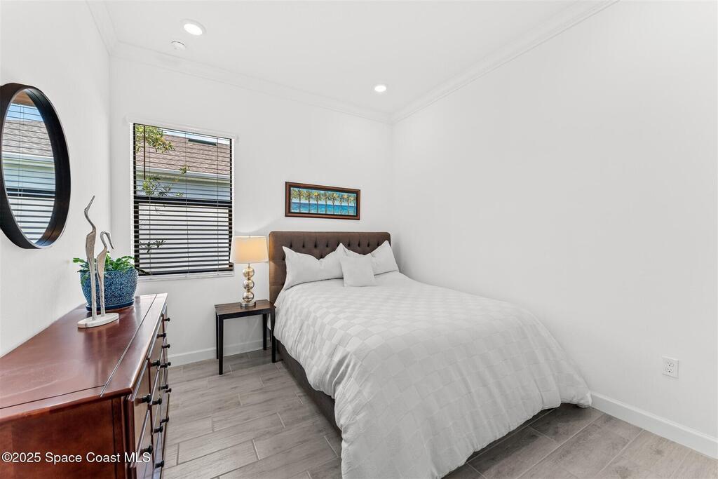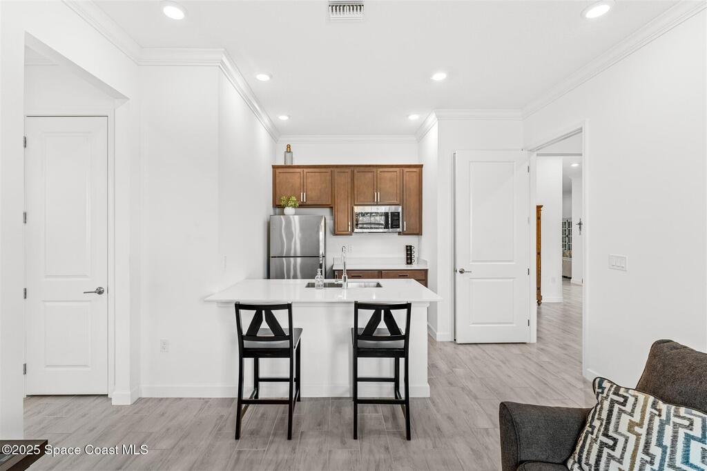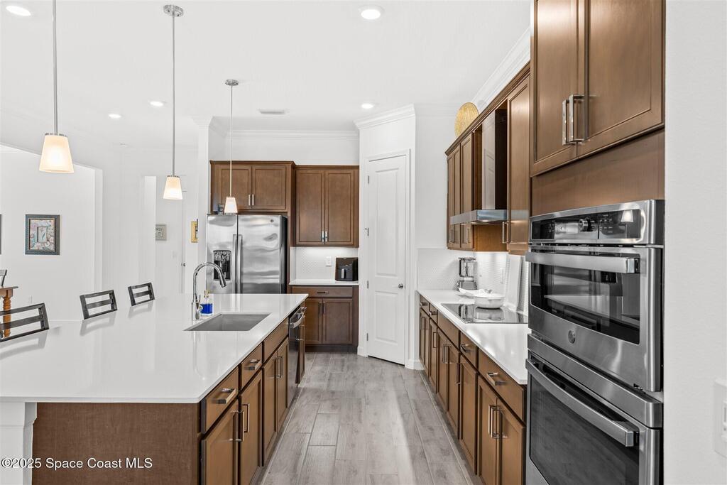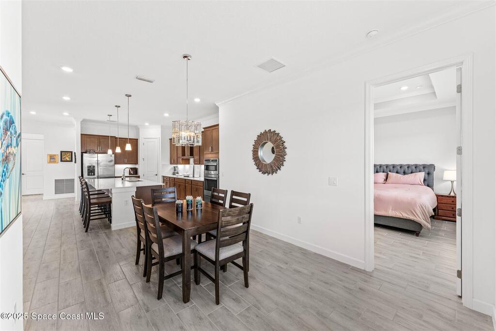 A must-see, this former builder's model with mother-in-law suite (ADU) attached, has all the extras! Situated on a waterfront lot with added landscaping, the next-gen floorplan in Bridgewater, Viera's popular 55+ resort style community, features a separate living suite with private entrance, kitchen and laundry, family room, full bath and bedroom and is perfect for an office, in-laws, and grown children. This beautifully decorated home with 3 additional bedrooms, 2 baths and a flex room, features plank tile throughout with color sealed grout adding beauty and ease of cleaning. The stunning gourmet kitchen features wall oven, a cooktop, designer hood, tiled backsplash w/ undercabinet lighting, pantry and a huge island! Crown molding and additional LED lighting in all rooms! Enjoy relaxing on the stone-faced front porch or on the screened lanai overlooking the lake and fountain! State of the art clubhouse with heated pool, spa, tennis, pickleball! Close to beaches! HOA maintains yard!