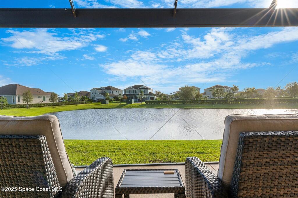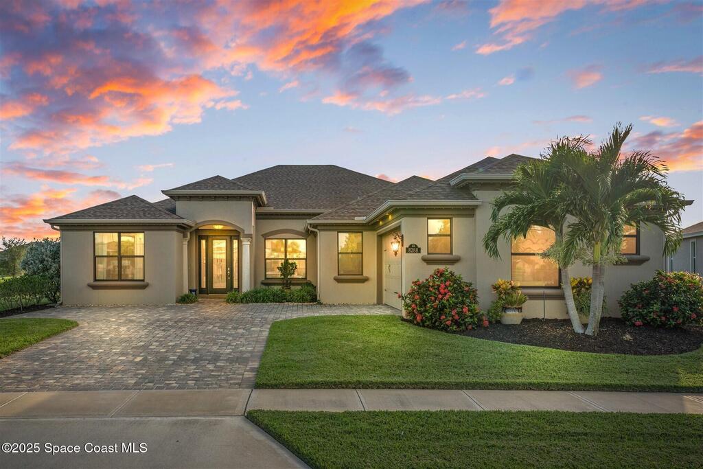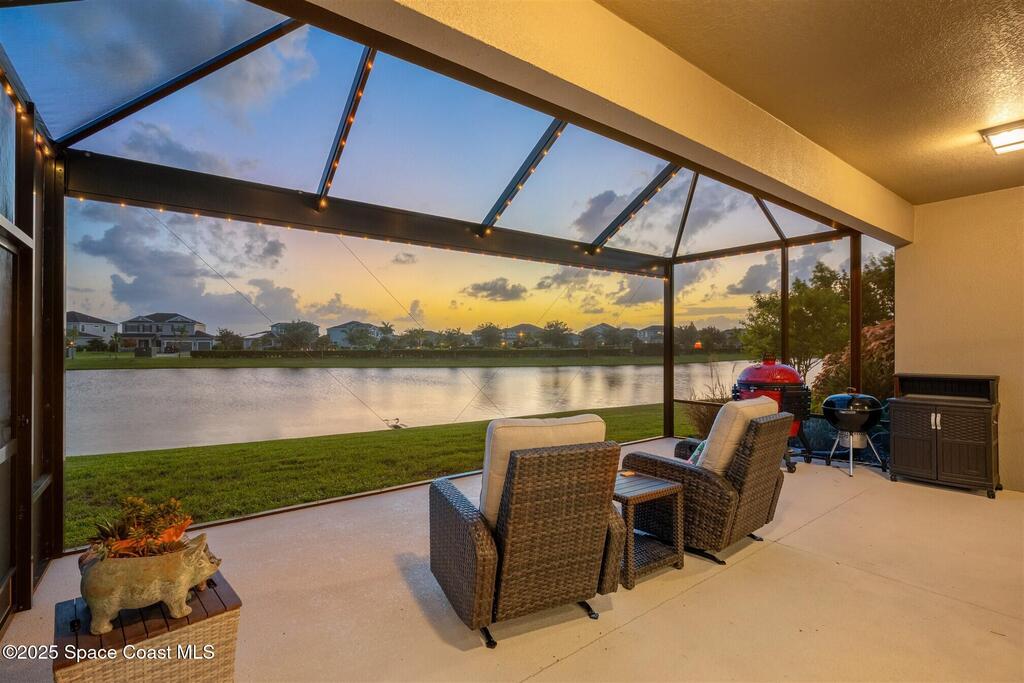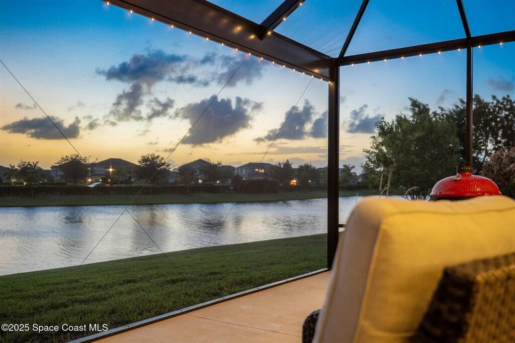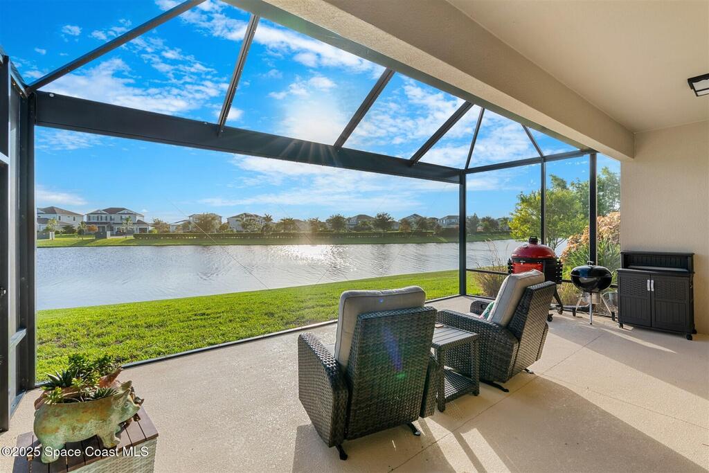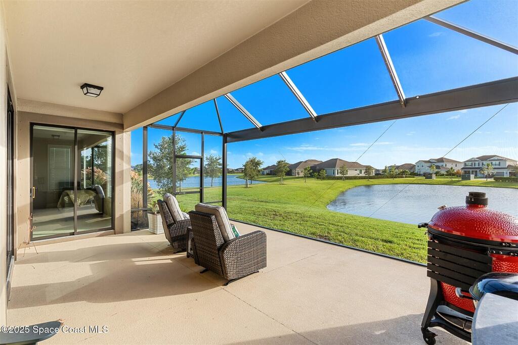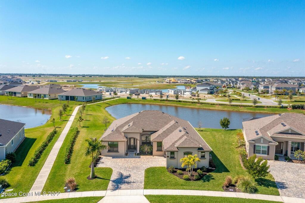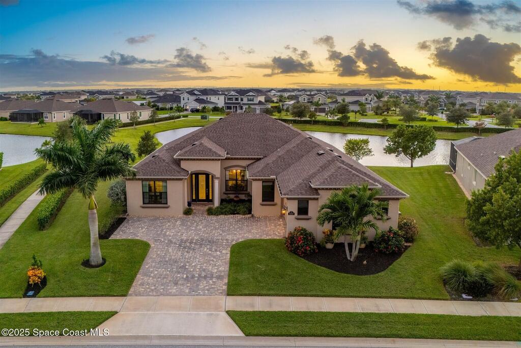Enjoy gorgeous lakefront views in this meticulously maintained contemporary CBS home in the sought-after gated community of Stonecrest at Viera. Located on one of the larger lots in the neighborhood, this house boasts double water views. Decorating for the seasons is as easy as pushing a button with the exterior custom lighting system. A glass-door entryway welcomes you into the open floorplan, with a formal dining room and flex/bonus room to either side of the foyer. Natural light from large double pane windows guide you through to the kitchen, great room, and breakfast nook. At the heart of the home, the light and bright kitchen offers stainless steel appliances, a vented hood, gas range, convention oven, a breakfast bar and pantry. Move through the 8 ft. sliders to the extended screened patio and take in the sparkling lake views while cooking on the grill. The expansive primary bedroom with its own sitting area includes a spacious ensuite SEE ''MORE