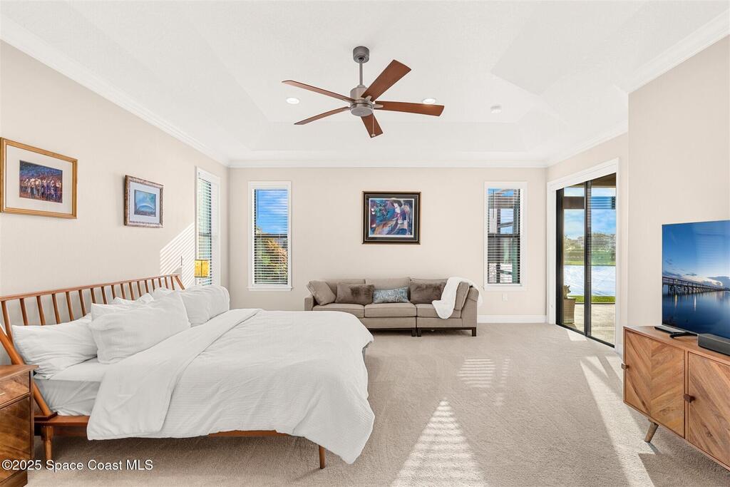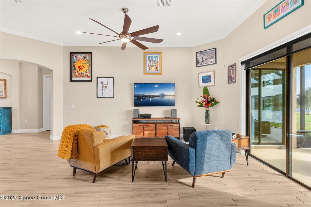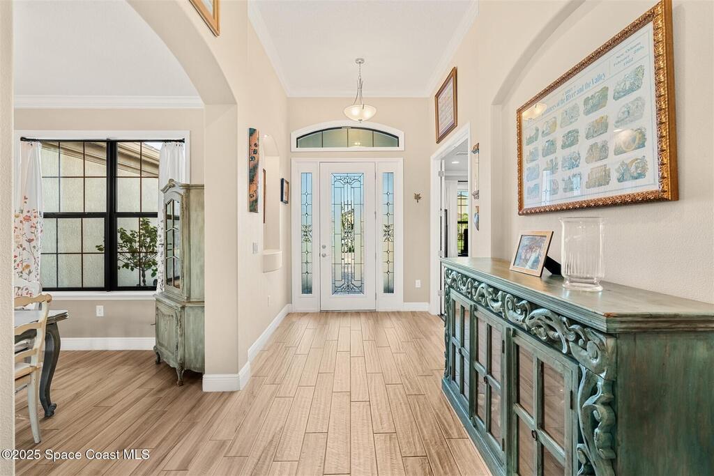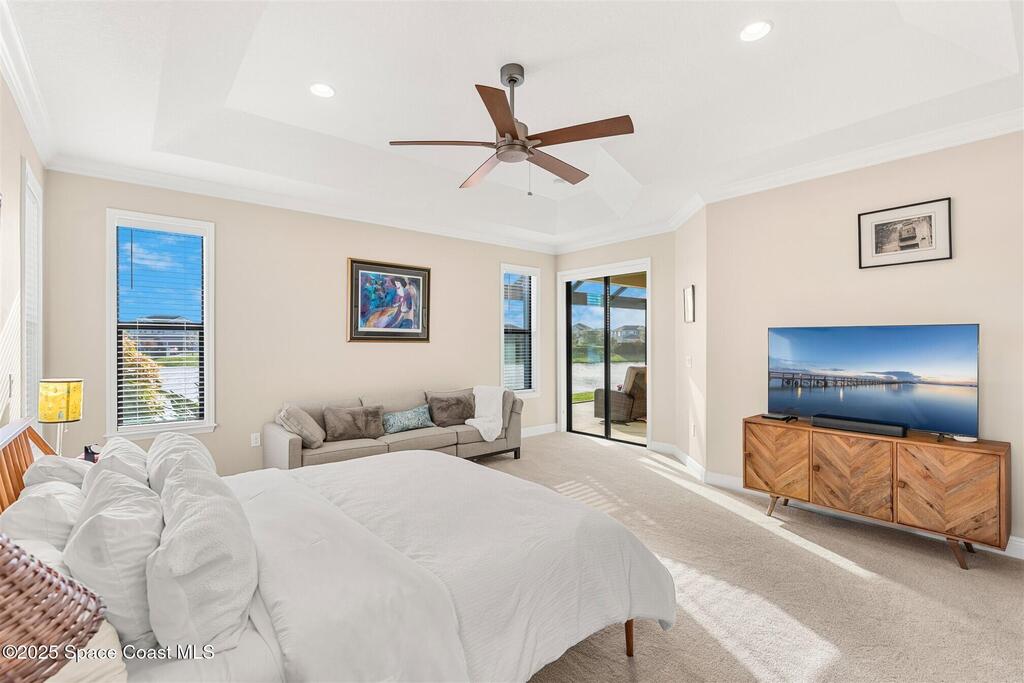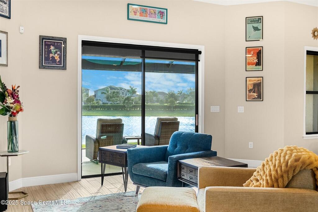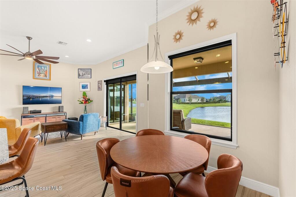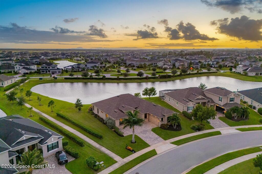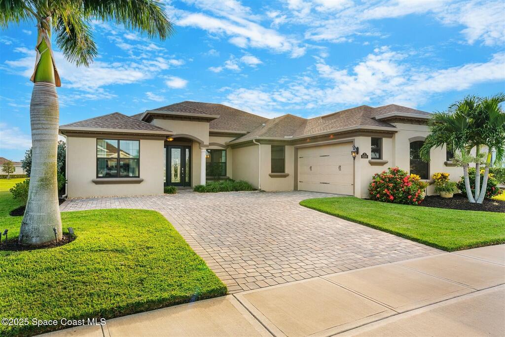 Enjoy gorgeous lakefront views in this meticulously maintained contemporary CBS home in the sought-after gated community of Stonecrest at Viera. Located on one of the larger lots in the neighborhood, this house boasts double water views. Decorating for the seasons is as easy as pushing a button with the exterior custom lighting system. A glass-door entryway welcomes you into the open floorplan, with a formal dining room and flex/bonus room to either side of the foyer. Natural light from large double pane windows guide you through to the kitchen, great room, and breakfast nook. At the heart of the home, the light and bright kitchen offers stainless steel appliances, a vented hood, gas range, convention oven, a breakfast bar and pantry. Move through the 8 ft. sliders to the extended screened patio and take in the sparkling lake views while cooking on the grill. The expansive primary bedroom with its own sitting area includes a spacious ensuite SEE ''MORE
