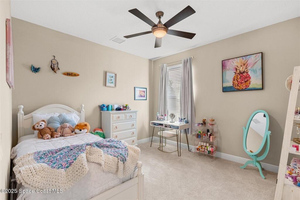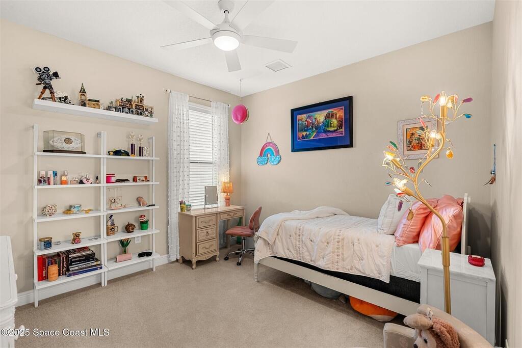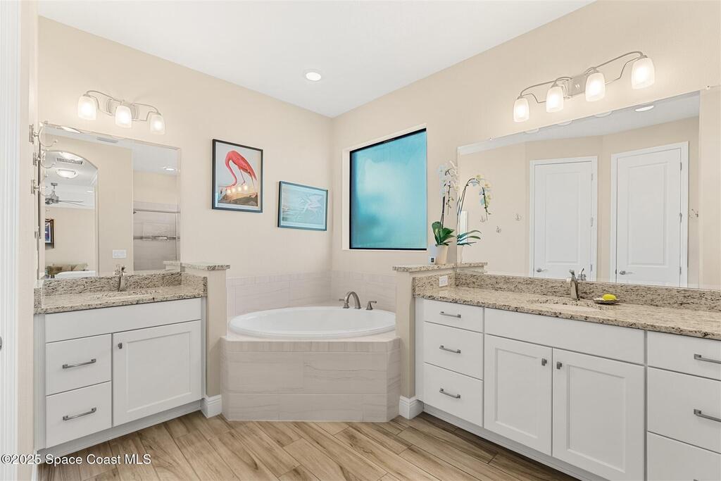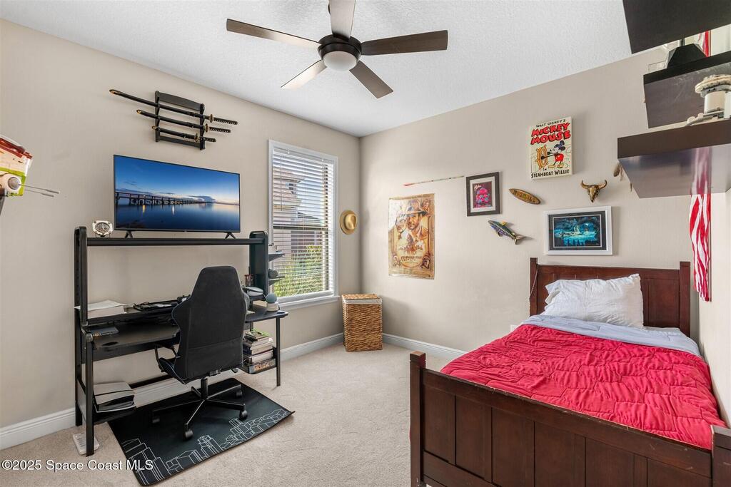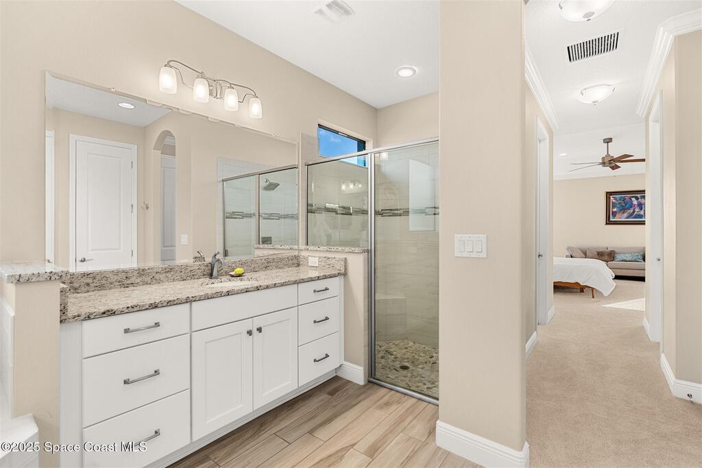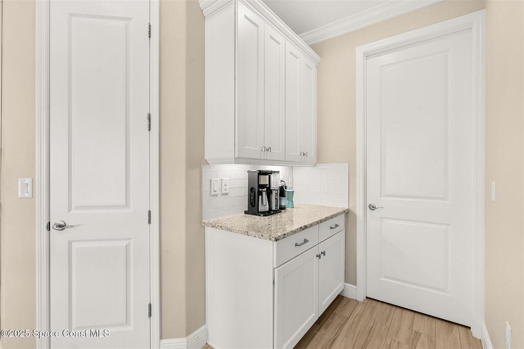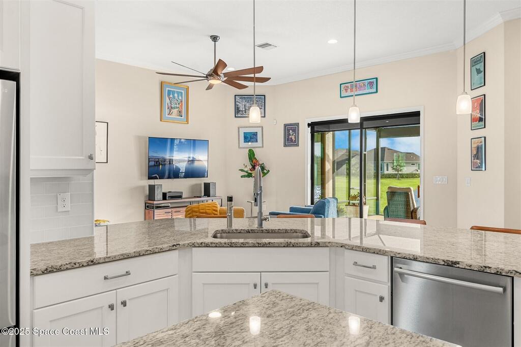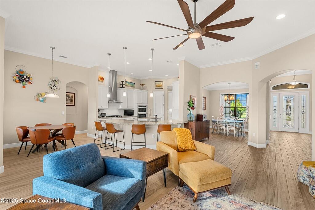 Enjoy gorgeous lakefront views in this meticulously maintained contemporary CBS home in the sought-after gated community of Stonecrest at Viera. Located on one of the larger lots in the neighborhood, this house boasts double water views. Decorating for the seasons is as easy as pushing a button with the exterior custom lighting system. A glass-door entryway welcomes you into the open floorplan, with a formal dining room and flex/bonus room to either side of the foyer. Natural light from large double pane windows guide you through to the kitchen, great room, and breakfast nook. At the heart of the home, the light and bright kitchen offers stainless steel appliances, a vented hood, gas range, convention oven, a breakfast bar and pantry. Move through the 8 ft. sliders to the extended screened patio and take in the sparkling lake views while cooking on the grill. The expansive primary bedroom with its own sitting area includes a spacious ensuite SEE ''MORE