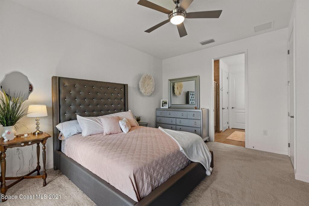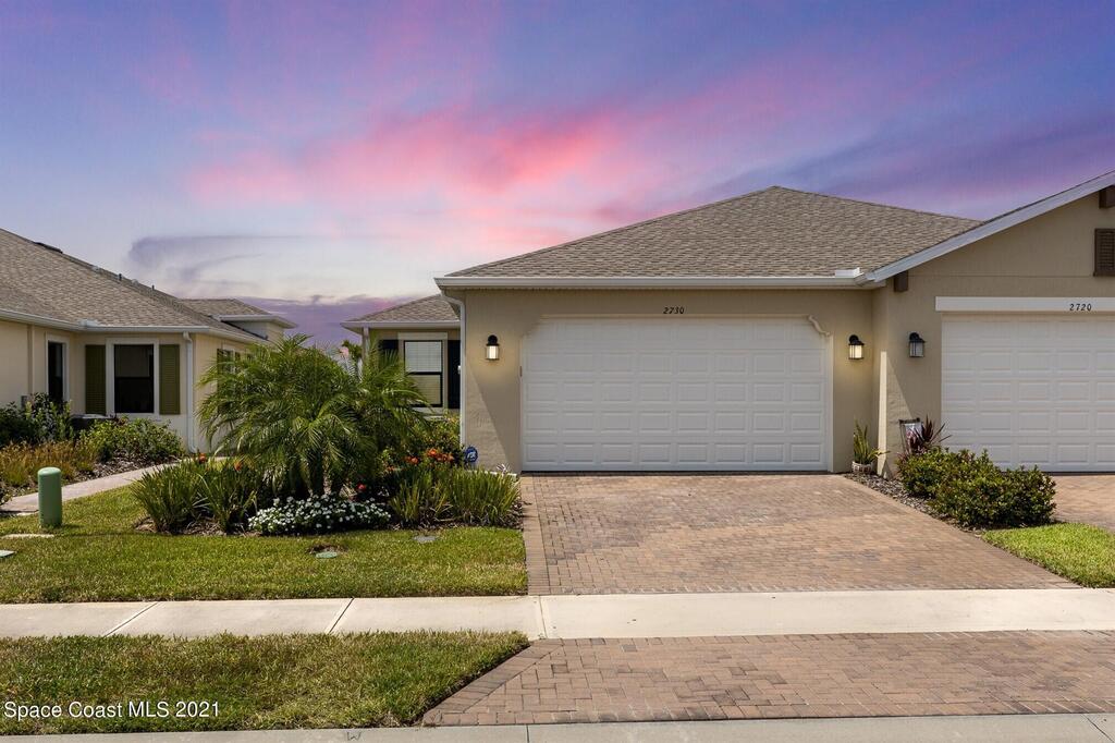 Why wait to buy new when you can have this like new 2-year old duplex in Bridgewater, Viera's newest resort style 55+ community! 2 bedrooms plus study, 2 bath, 2 car garage w/ sought after white cabinets, marble tiled backsplash, quartz counters, tile floors in main areas - all in today's grays and whites!! Open floorplan! Great room and owner's suite w/ sliders to large screened lanai. Owner's luxurious bath with large two sink vanity and sumptuous walk-in tiled shower with bench!Features include 8' doors, laundry w/ utility tub, radiant barrier in attic, gutters, wood look blinds, double doors on study, ceiling fans, screened paver lanai and entry, smart home thermostat, doorbell and front lock system! Bridgewater has amazing pool w/waterfall & spa, fitness room, tennis and bocce court