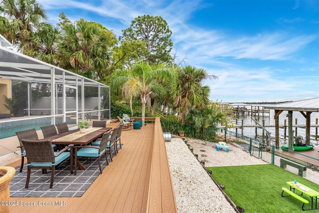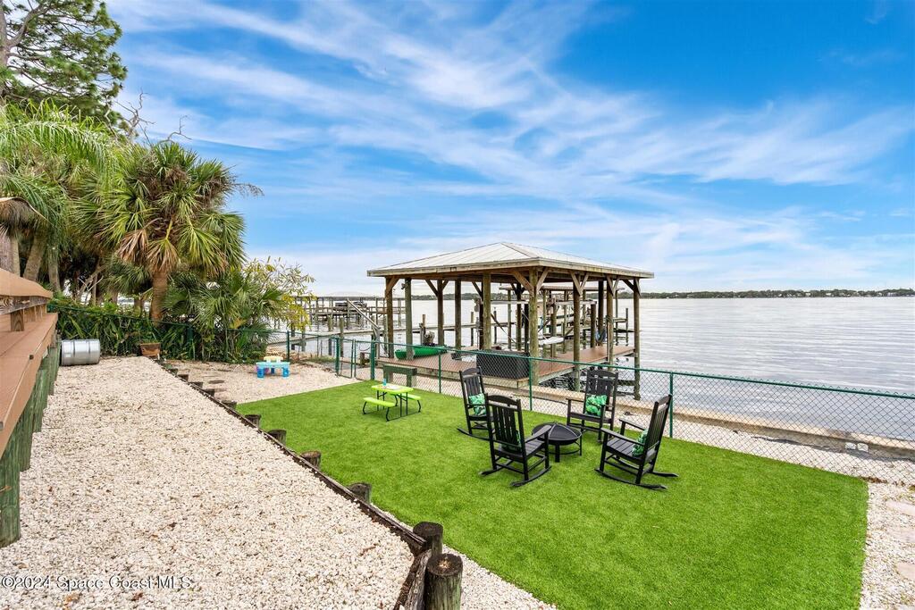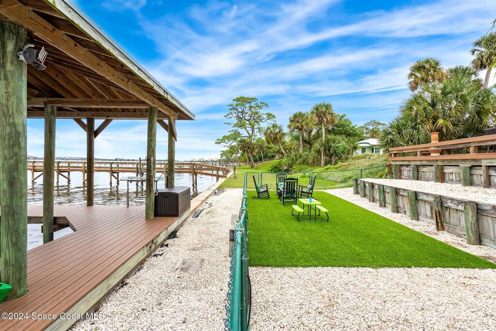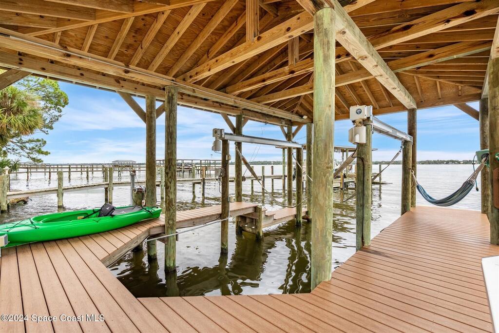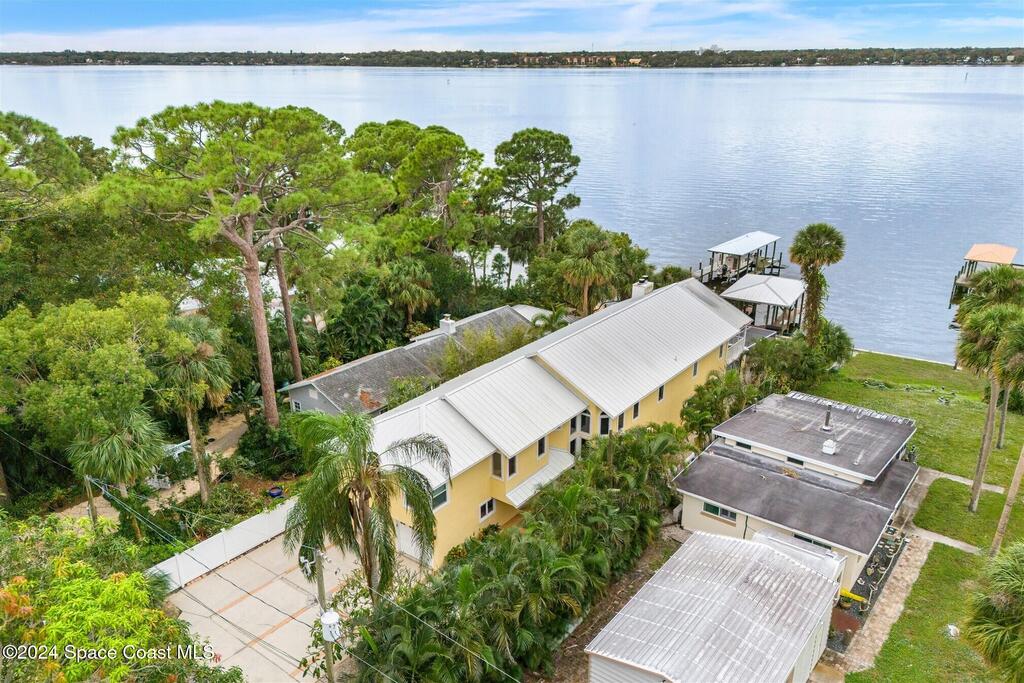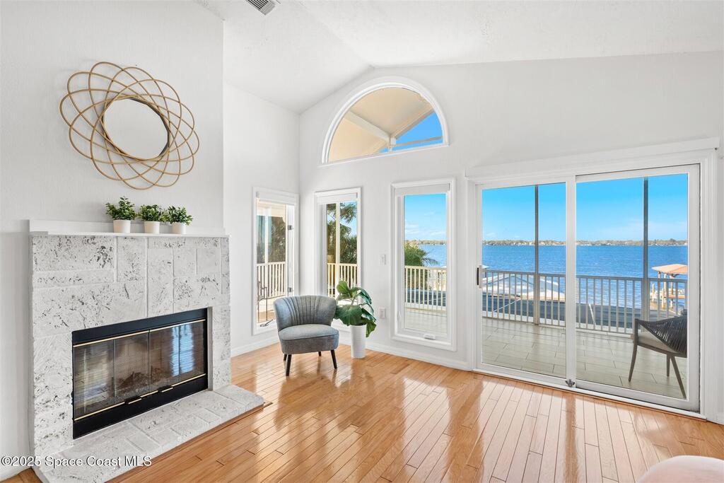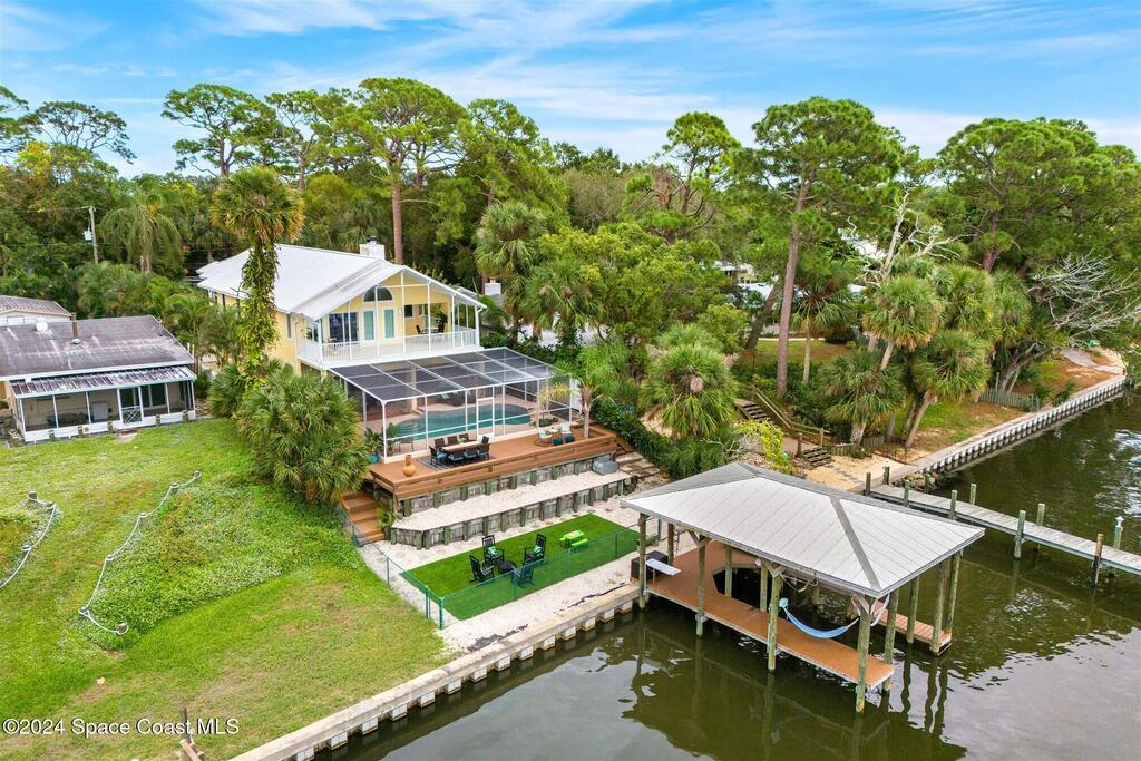 Incredible waterfront opportunity--13 feet above sea level with NO flood insurance required! This spacious 3,960 sq ft home features 4 bedrooms, 3.5 baths, an office, loft, and bonus room, offering versatile space for families or multigenerational living. Boaters will love the covered dock with 6,000 lb boat lift, jet ski lift, and composite decking, all overlooking the Indian River. Enjoy direct river frontage, and easy access to sandbar islands, dockside restaurants, and more. The home features a private in-law suite with its own entrance, kitchen, living room, bedroom, and bath--perfect for guests or rental income. Upstairs, the luxurious primary suite offers floor-to-ceiling windows, private balcony, jacuzzi tub, and walk-in shower overlooking the water. A coral stone fireplace, tankless gas water heater, stainless steel appliances, and new metal roof (2022) add both charm and function. See ''MORE''