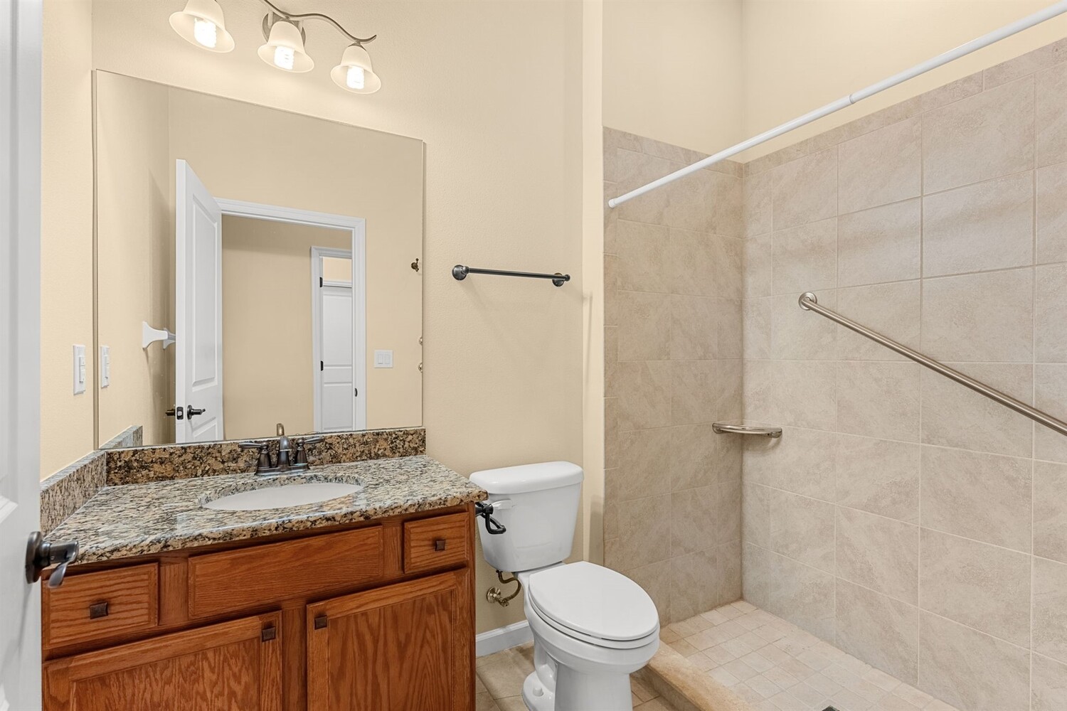Beautiful home in the gated 55+ community of Alamanda Key! This open floor plan offers a spacious great room and kitchen with granite countertops, stainless steel appliances, and a large screened patio overlooking serene fields and a lake. Tile flooring flows throughout the main living areas. The split bedroom layout includes a primary suite with two closets, double sinks, and a large walk-in shower. Additional features include an inside laundry room and a two-car garage with a unique ramp-style floor. Enjoy community amenities like a clubhouse and pool in this vibrant, active adult neighborhood!